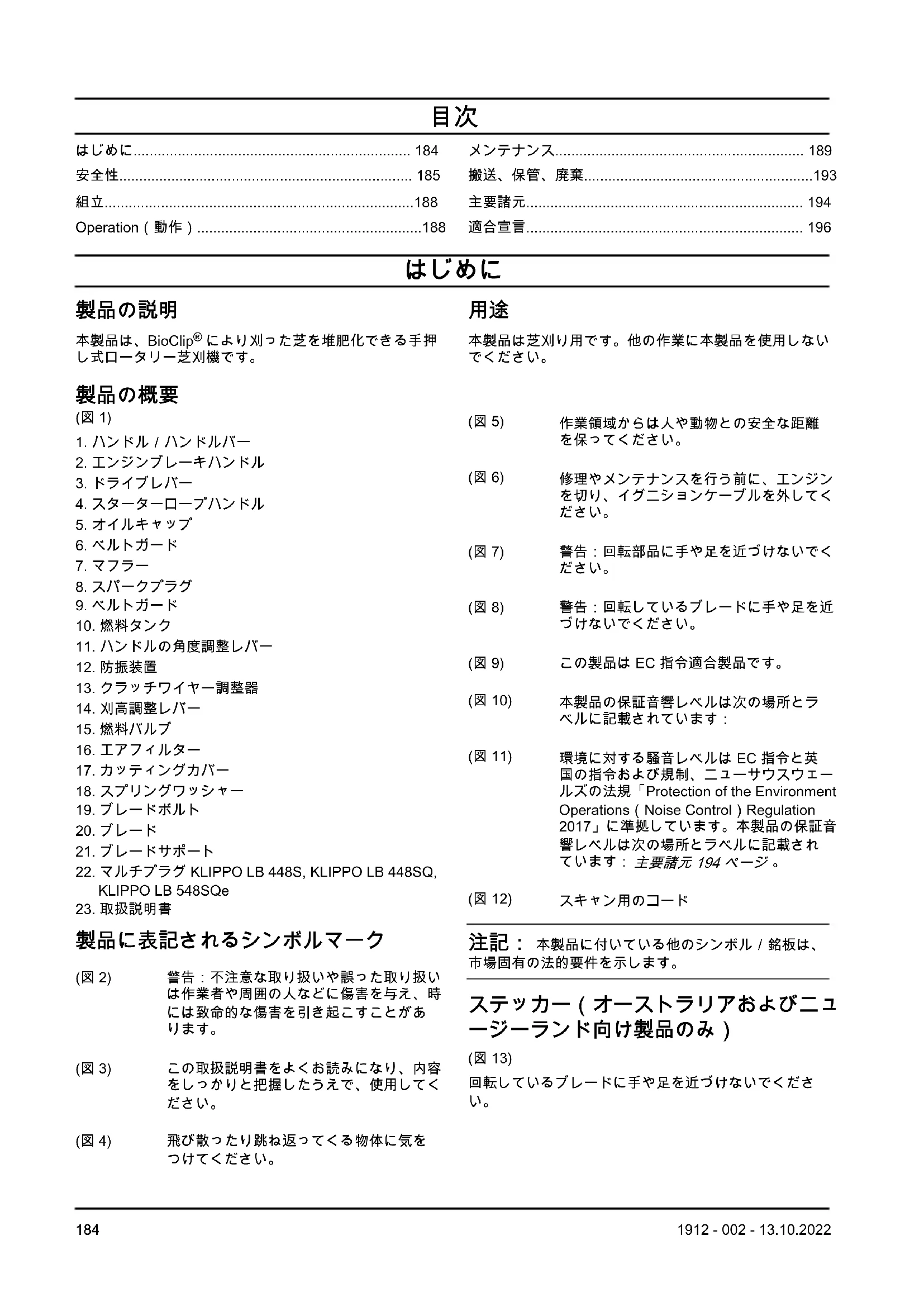 2006/42/EC 「機械類に関する」 2014/30/EU 「電磁環境適合性に関する」 2000/14/EC 「環境への騒音排出に関する」 2011/65/EU 「電気・電子製品に含まれる特定有害物質の使用制限に関する」 および以下の規格または技術仕様が適用されています。 EN ISO 5395-1:2013/A1:2018, EN ISO 5395-2:2013/
