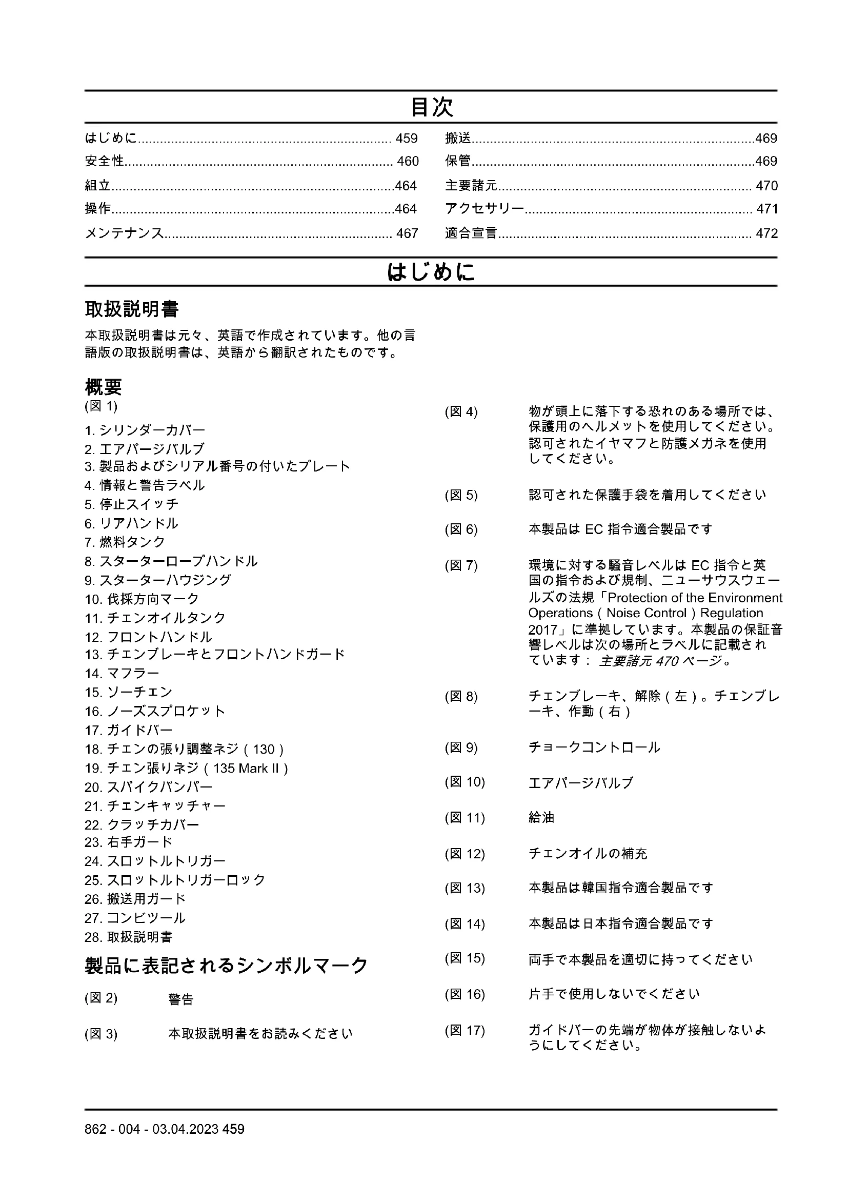 等価騒音レベルは、さまざまな作動状態における騒音レベルの時間加重エネルギーとして計算されます。等価 騒音レベルの一般的な統計上のばらつきは、2.5 dB(A)の標準偏差となります。 470 862 - 004 - 03.04.2023単位 130(H13038HV) 135 Mark II (H13038HV) ソーチェンのピッチ mm(イン