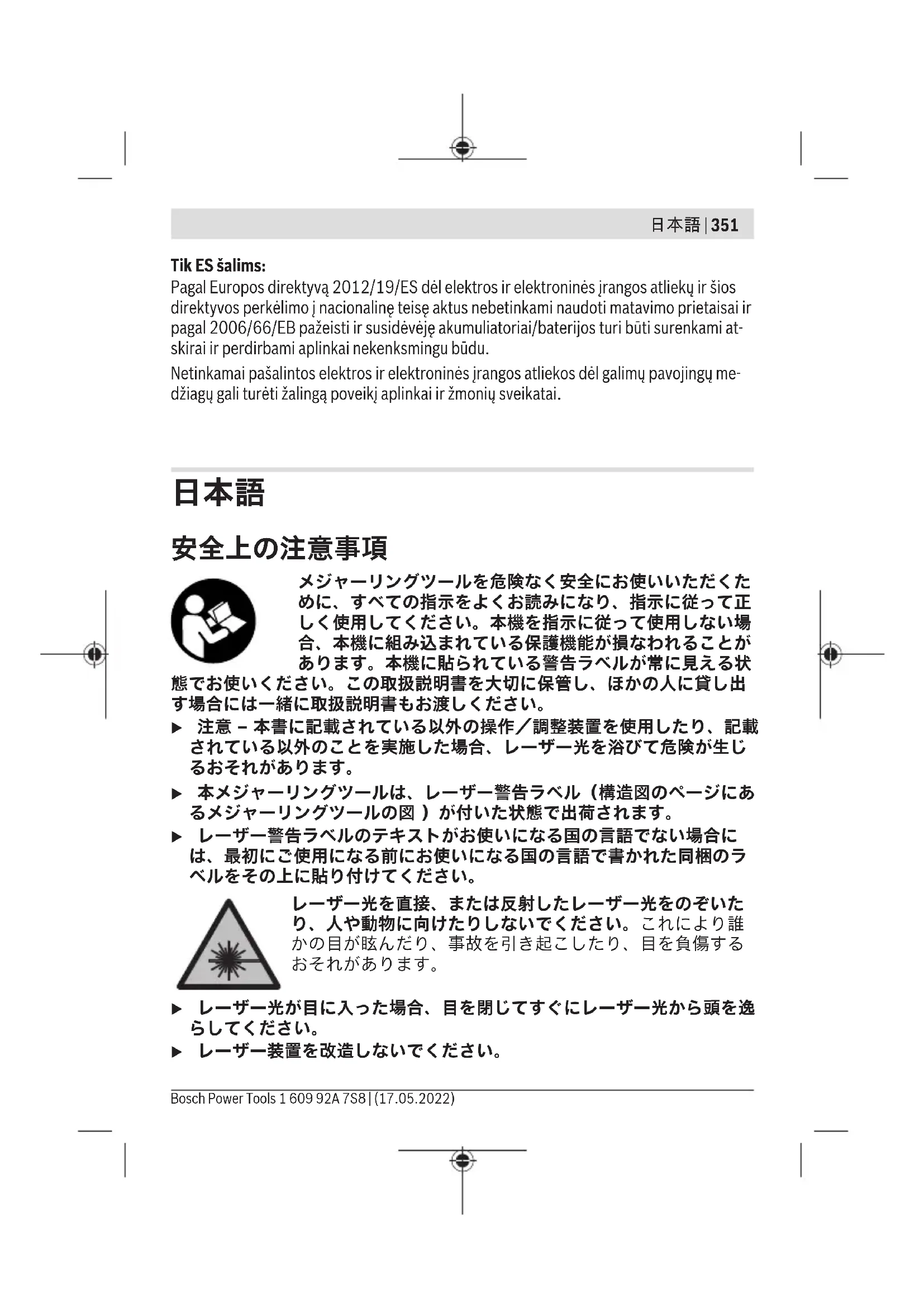 u 本メジャーリングツールは、レーザー警告ラベル(構造図のページにあ るメジャーリングツールの図 )が付いた状態で出荷されます。 u レーザー警告ラベルのテキストがお使いになる国の言語でない場合に は、最初にご使用になる前にお使いになる国の言語で書かれた同梱のラ ベルをその上に貼り付けてください。 レーザー光を直接、または反射したレーザー光をのぞいた り、人や動物に向けたりしないでください。これにより誰 かの目が眩んだり、事故を引き起こしたり、目を負傷する