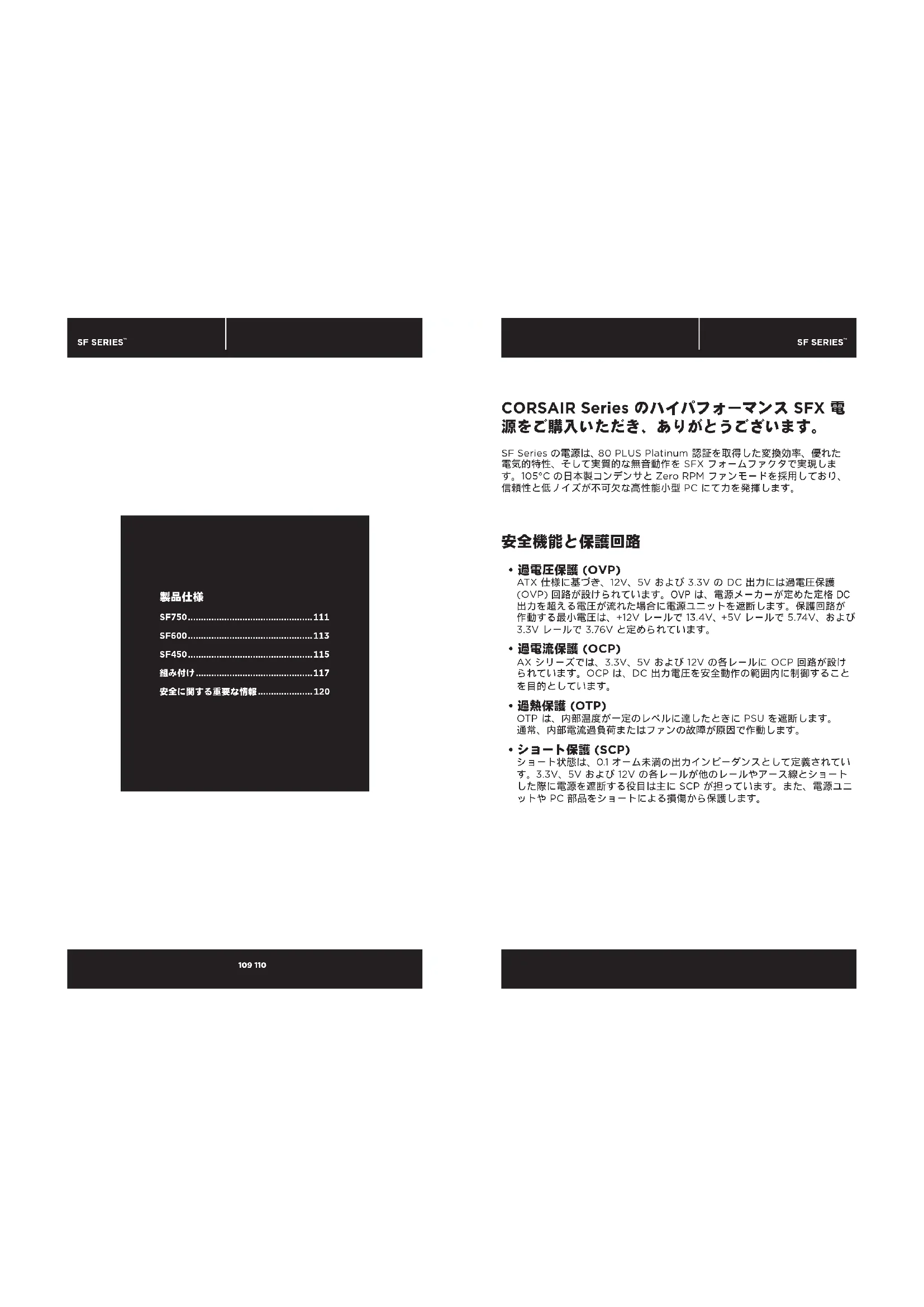 - 安全に関する重要な情報 CORSAIR Series のハイパフォーマンス SFX 電 源をご購入いただき、ありがとうございます。 SF Series の電源は、80 PLUS Platinum 認証を取得した変換効率、優れた 電気的特性、そして実質的な無音動作を SFX フォームファクタで実現しま す。105°C の日本製コンデンサと Zero RPM ファンモードを採用しており、 信頼性と低ノイズが不可欠な高性能小型 PC にて力を発揮します。 p. 120