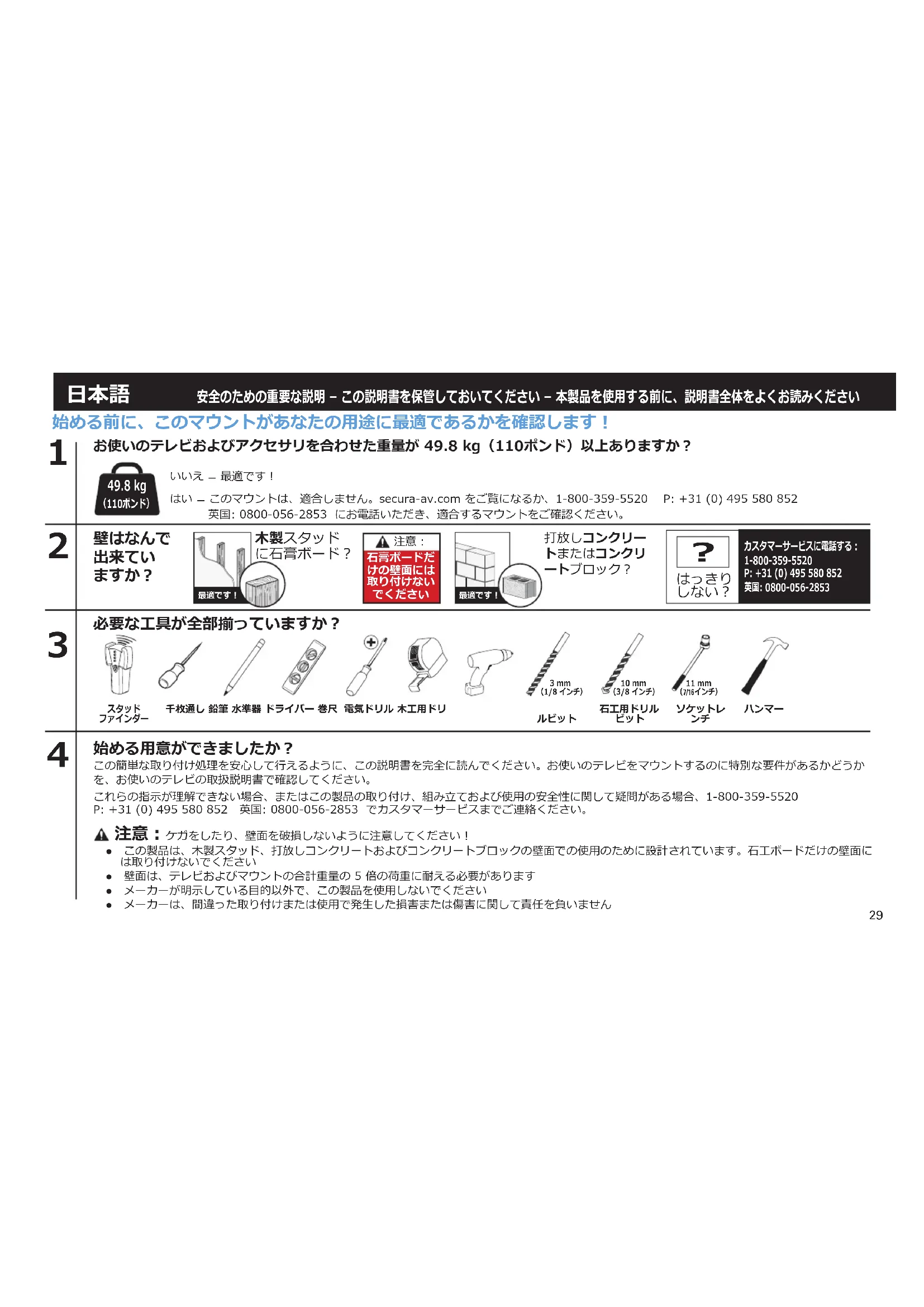 このマウントは、適合しません。secura-av.com をご覧になるか、1-800-359-5520 P: +31 (0) 495 580 852 英国: 0800-056-2853 にお電話いただき、適合するマウントをご確認ください。 始める用意ができましたか? この簡単な取り付け処理を安心して行えるように、この説明書を完全に読んでください。お使いのテレビをマウントするのに特別な要件があるかどうかを、お使いのテレビの取扱説明書で確認してください。これらの指示が理解できない場合、またはこの製品の取り付け、組み立ておよび使用の安全性に関して疑問がある場合、1-800-359-5520 P: +31 (0) 495 580 852 英国: 0800-056-2853 でカスタマーサービスまでご連絡ください。 注意:ケガをしたり、壁面を破損しないように注意してください! ● この製品は、木製スタッド、打放しコンクリートおよびコンクリートブロックの壁面での使用のために設計されています。石工ボードだけの壁面には取り付けないでください ● 壁面は、テレビおよびマウントの合計重量の 5 倍の荷重に耐える必要があります ● メーカーが明示している目的以外で、この製品を使用しないでください ● メーカーは、間違った取り付けまたは使用で発生した損害または傷害に関して責任を負いません 始める前に、このマウントがあなたの用途に最適であるかを確認します!