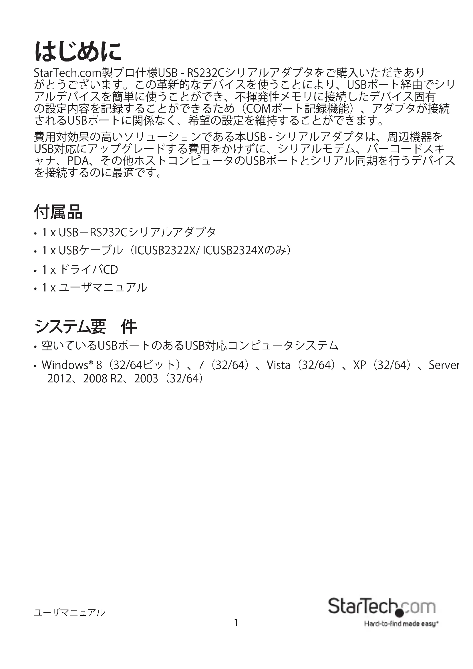StarTech.com製プロ仕様USB - RS232Cシリアルアダプタをご購入いただきあり がとうございます。この革新的なデバイスを使うことにより、USBポート経由でシリ アルデバイスを簡単に使うことができ、不揮発性メモリに接続したデバイス固有 の設定内容を記録することができるため(COMポート記録機能)、アダプタが接続 されるUSBポートに関係なく、希望の設定を維持することができます。 費用対効果の高いソリューションである本USB - シリアルアダプタは、周辺機器を USB対応にアップグレードする費用をかけずに、シリアルモデム、バーコードスキ ャナ、PDA、その他ホストコンピュータのUSBポートとシリアル同期を行うデバイス を接続するのに最適です。