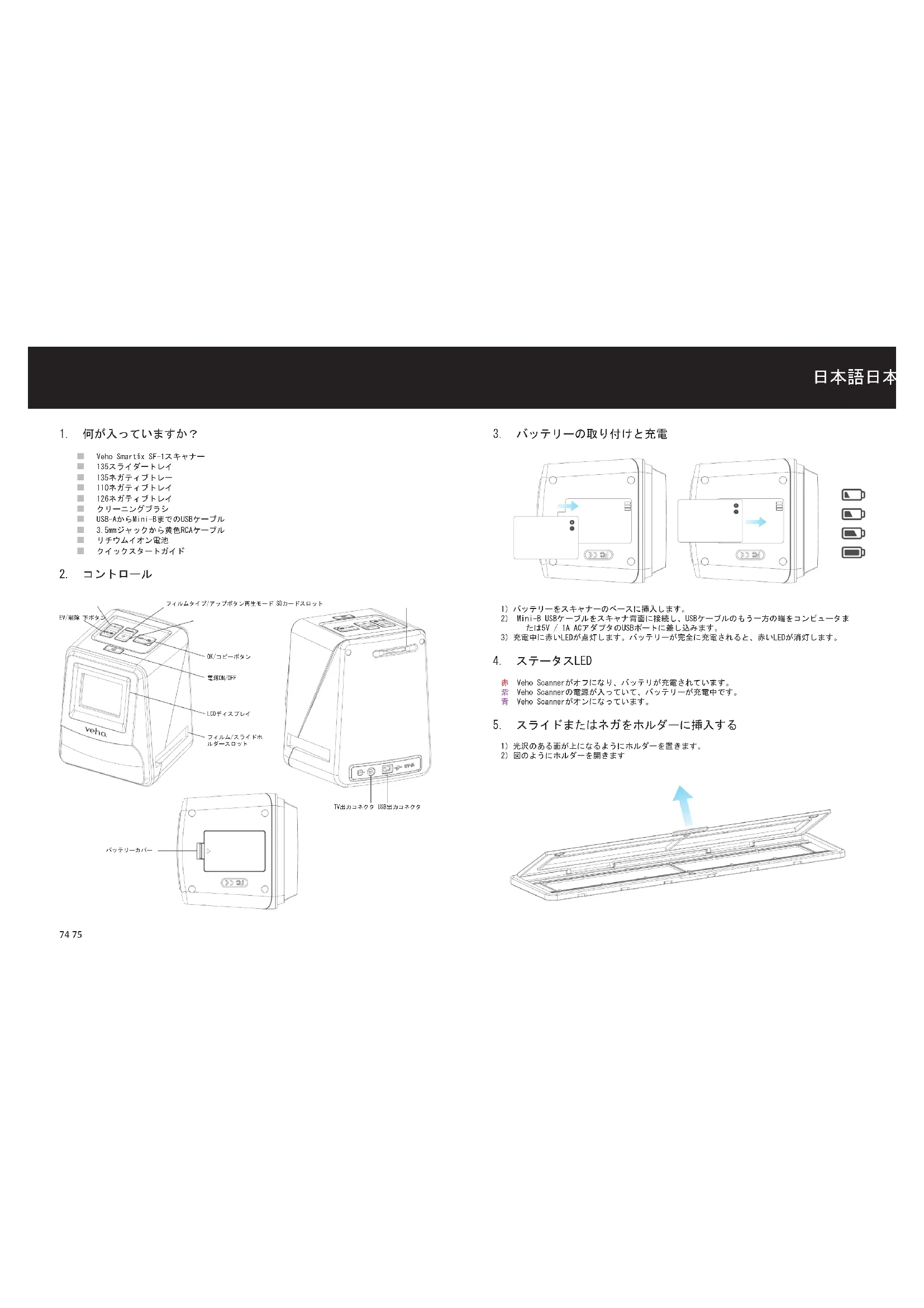 ¢ VehoSmartxSF-1スキャナー ¢ 135スライダートレイ ¢ 135ネガティブトレー ¢ 110ネガティブトレイ ¢ 126ネガティブトレイ ¢ クリーニングブラシ ¢ USB-AからMini-BまでのUSBケーブル ¢ 3.5mmジャックから黄色RCAケーブル ¢ リチウムイオン電池 ¢ クイックスタートガイド