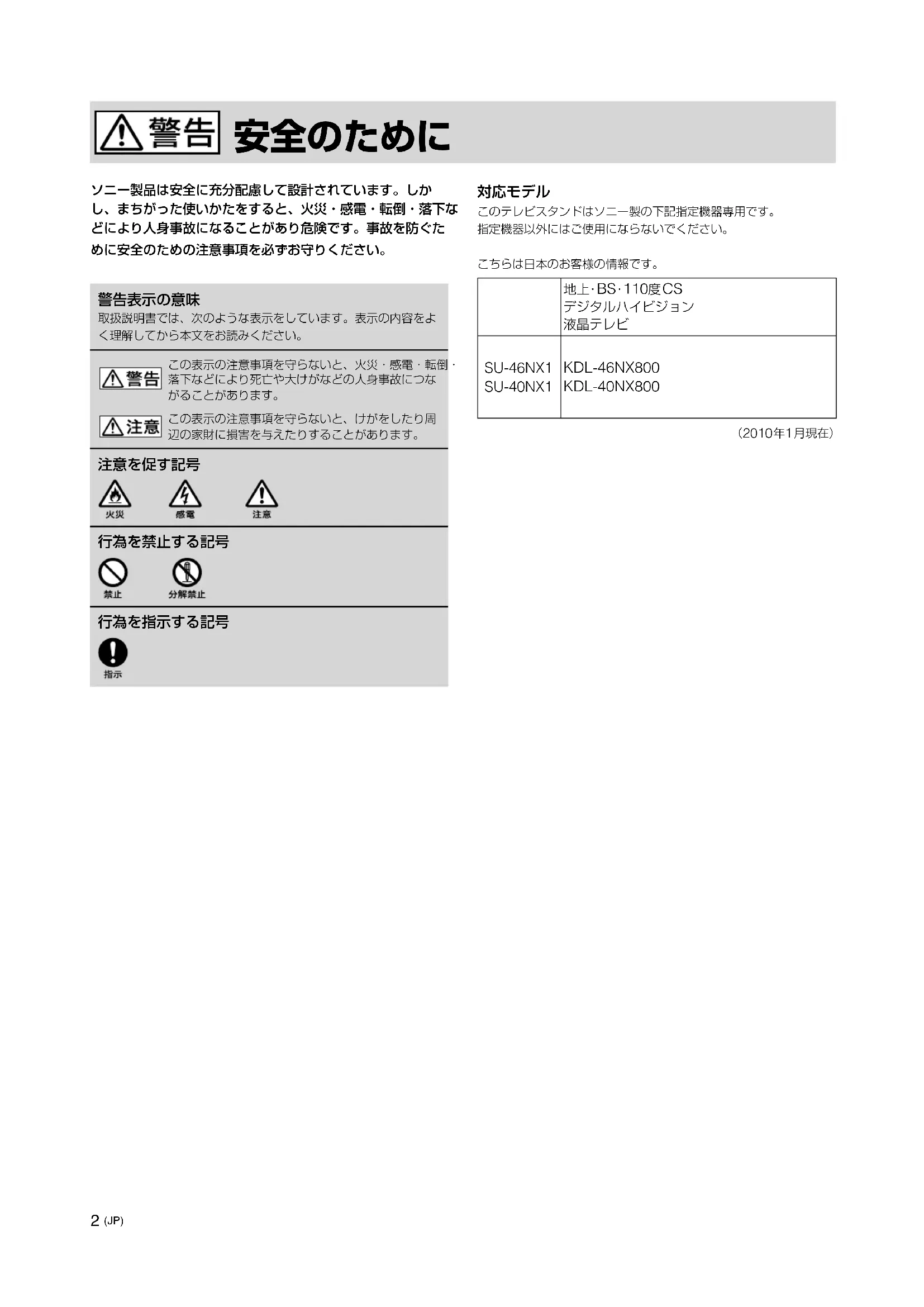 機器などに電源コードをはさみこむと、ショートして感電する恐れがあります。また、電源コードや接続ケーブルを引っかけると、転んだりスタンドが倒れたりしてけがの原因となることがありま テレビの設置場所を決め、あらかじめテレビスタンドを置く。テレビは重いので、取り付ける前に場所を決め、テレビスタンドを組み立ててください。テレビ本体付属の取扱説明書を参照して、テレビからテーブルトップスタンドとボトムカバーをはずしてください。Actual total number: Sony SU-52/46/40NX1