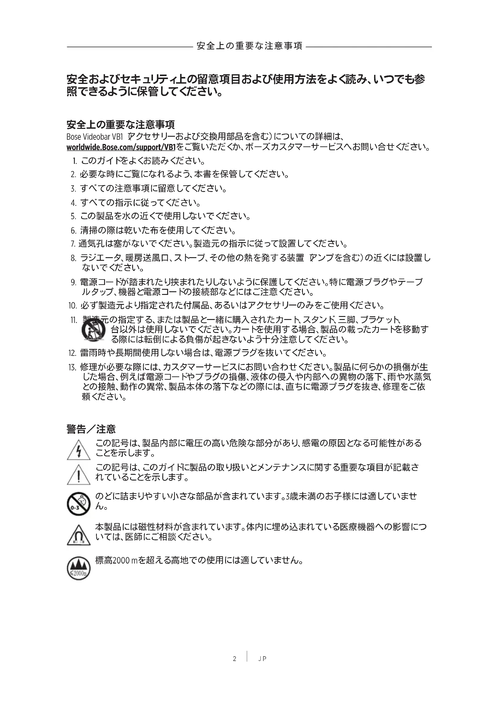 安全上の重要な注意事項 安全およびセキュリティ上の留意項目および使用方法をよく読み、いつでも参 照できるように保管してください。 安全上の重要な注意事項 Bose Videobar VB1(アクセサリーおよび交換用部品を含む)についての詳細は、 worldwide.Bose.com/support/VB1をご覧いただくか、ボーズカスタマーサービスへお問い合せください。