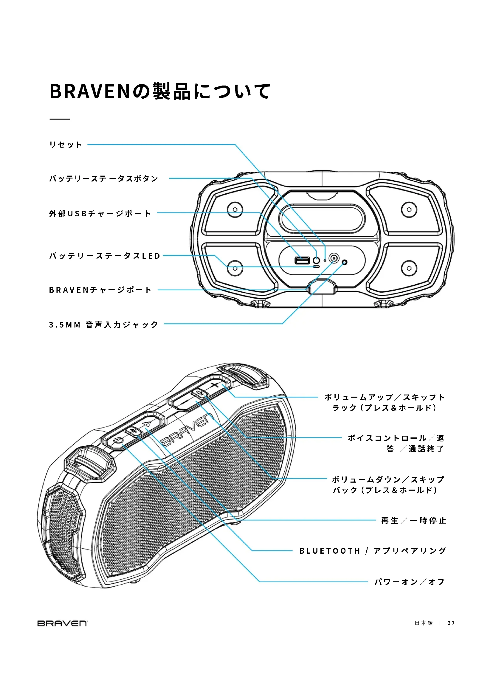 音量を上げるには短く「+」ボタンを押してください。音量を左舷るには「-」ボタンを押してください。最大ボリュ ームに達した場合オーディオ・キューが聞こえます。 スキップして 次のトラップ に 進 む に は 、「+」ボタン を長 押ししてくだ さい 。スキップして 前 のトラックに 進むには 、 「-」ボタンを押してください。 BRAVEN BLUETOOTHスマートの使用 BRAVEN READYアウトドアスピーカーアプリをGoogle PlayもしくはApp Storeからダウンロードして電源オ ン、オーディオストリーミングペアを設 定して視聴経験をカスタマイズしよう。 電源とBLUE TOOTH ペアリング