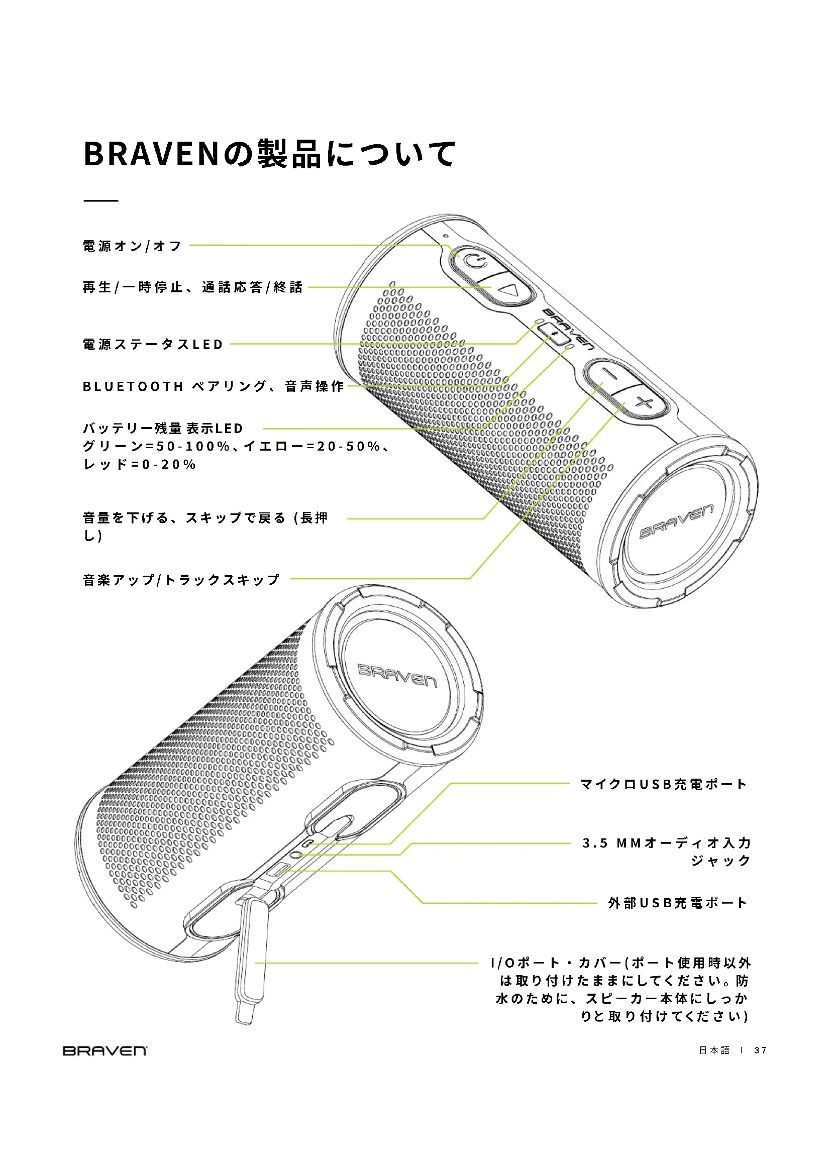 样类型或等效类型的电池来更换。日本語 | 37 BRAVENの製品について 電 源 オ ン / オ フ 再生/一時停止、通話応答/終話 BLUETOOTH ペアリング、音声操作 I/Oポート・カバー(ポート使用時以外 は 取 り 付 け た ま ま に してく だ さ い 。防 水のために、スピーカー本体にしっか りと 取 り 付 け てくだ さ い ) 音量を下げる、スキップで戻る (長押