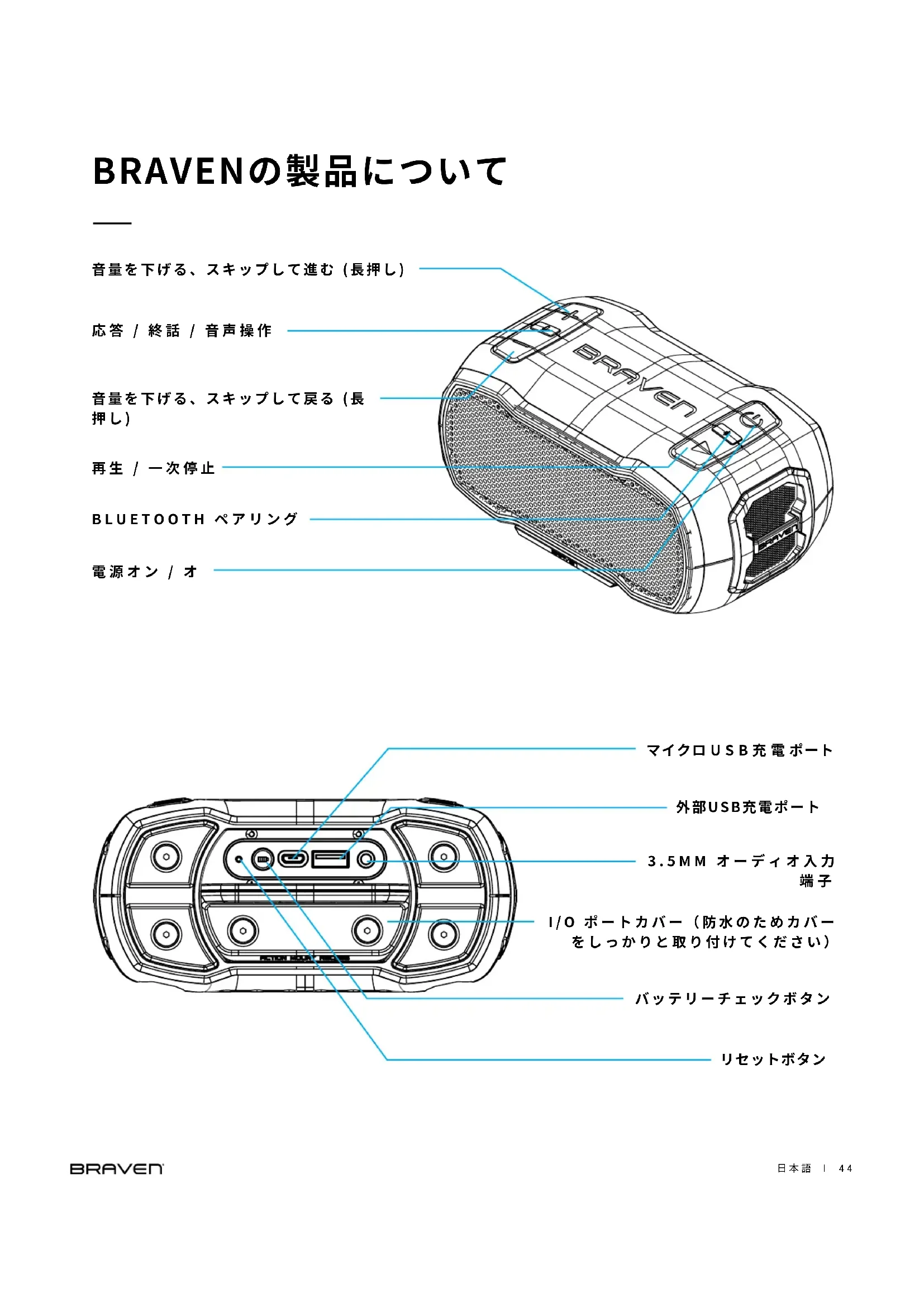 ーディオキューが聞こえるまで、2-3秒間 Bluetooth ボタンを長押ししてください。二番目の端末 の Bluetooth 設定を開き、「BRAVEN READY SOLO」を選んでペアリングを完了してください。 BRAVEN は、最後にペアリングを行った8件の端末を保存しています。 注意 : BRAVEN 端末の電源を入れたままで、Bluetooth® の操作が30分間行われなかった場合、自動的に 電源が切れます。BRAVEN の電源を入れるには、オーディオキューが聞こえるまで、2-3秒間電源ボタンを長