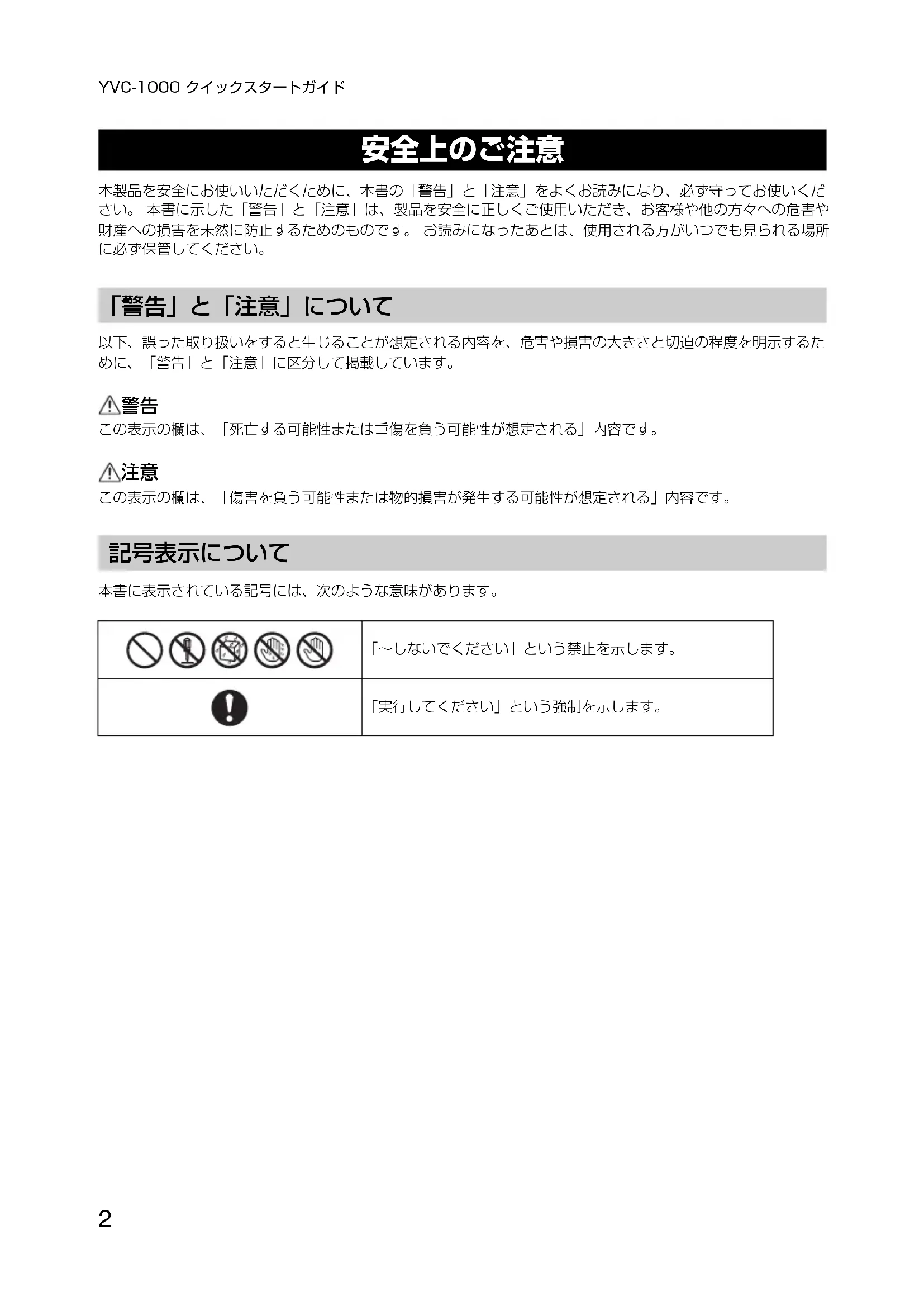 「〜しないでください」という禁止を示します。 「実行してください」という強制を示します。YVC-1000クイックスタートガイド