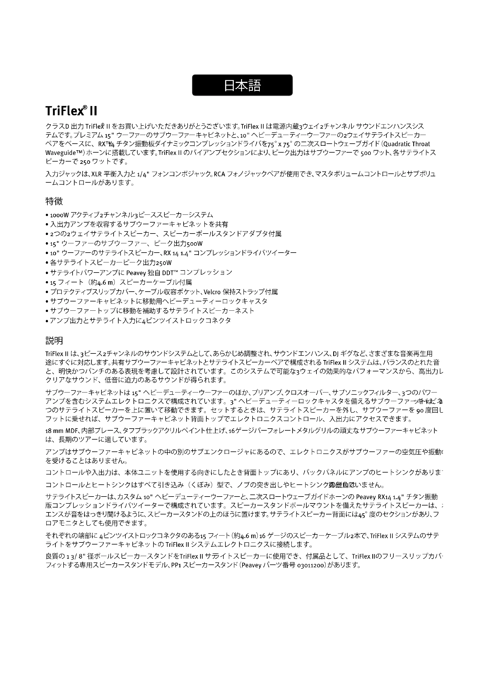 II をお買い上げいただきありがとうございます。TriFlex II は電源内蔵3ウェイ2チャンネル サウンドエンハンスシス テムです。プレミアム 15" ウーファーのサブウーファーキャビネットと、10" ヘビーデューティーウーファーの2ウェイサテライトスピーカー ペアをベースに、RX™ 14 チタン振動板ダイナミックコンプレッションドライバを75° x 75° の二次スロートウェーブガイド(Quadratic Throat Waveguide™)ホーンに搭載しています。TriFlex II のバイアンプセクションにより、ピーク出力はサブウーファーで 500 ワット、各サテライトス ピーカーで 250 ワットです。 入力ジャックは、XLR 平衡入力と 1/4" フォンコンボジャック。RCA フォノジャックペアが使用でき、マスタボリュームコントロールとサブボ