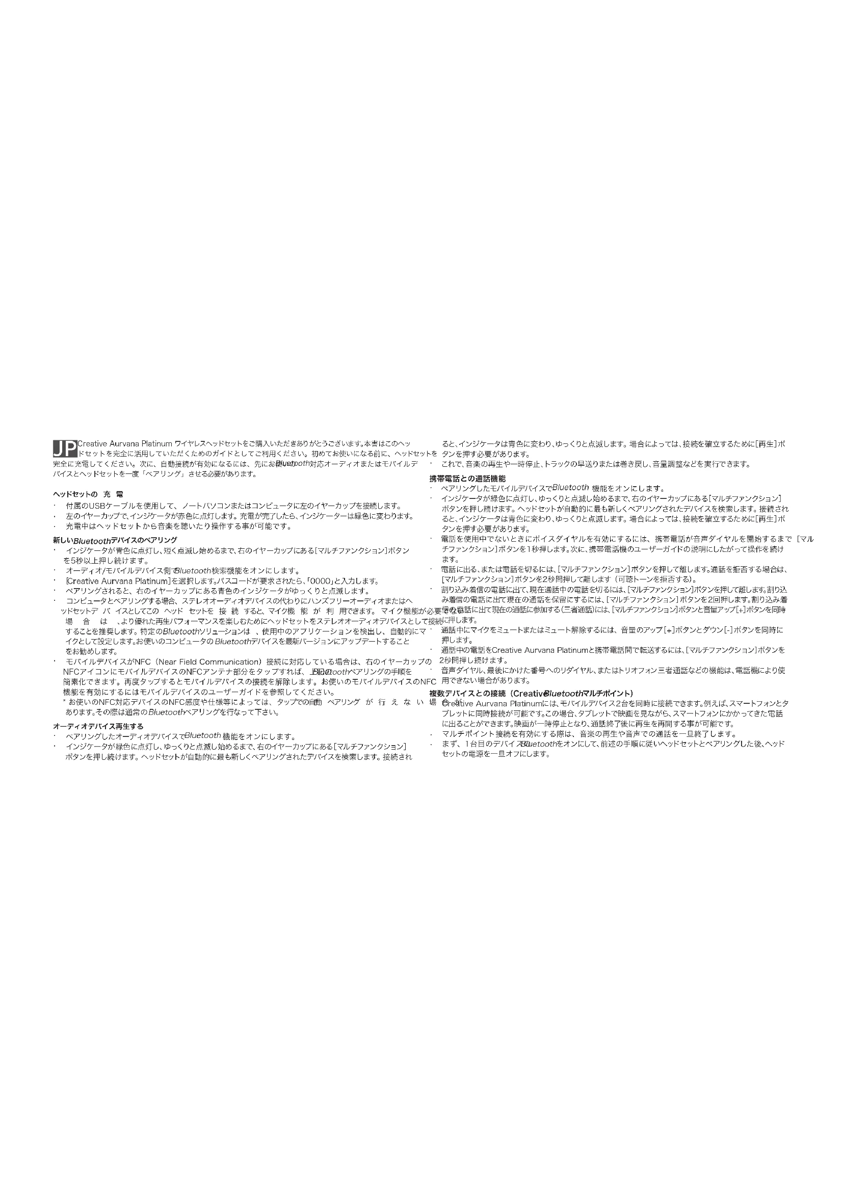 Sol kulaklık göstergesi Kırmızı: Uçak modunda. Kırmızı ve iki kez yanıp sönüyor: Dış mekan modunda. Kırmızı ve üç kez yanıp sönüyor: İç mekan modunda. Kırmızı: mikrofonlu kulaklık şarj oluyor. Tümüyle şarj olduğunda bu gösterge Yeşile dönüşür.JP CreativeAurvanaPlatinumワイヤレスヘッドセットをご購入いただきありがとうございます。本書はこのヘッ ドセットを完全に活用していただくためのガイドとしてご利用ください。初めてお使いになる前に、ヘッドセットを完全に充電してください。次に、自動接続が有効になるには、先にお使いの Bluetooth 対応オーディオまたはモバイルデバイスとヘッドセットを一度「ペアリング」させる必要があります。ヘッドセットの 充 電