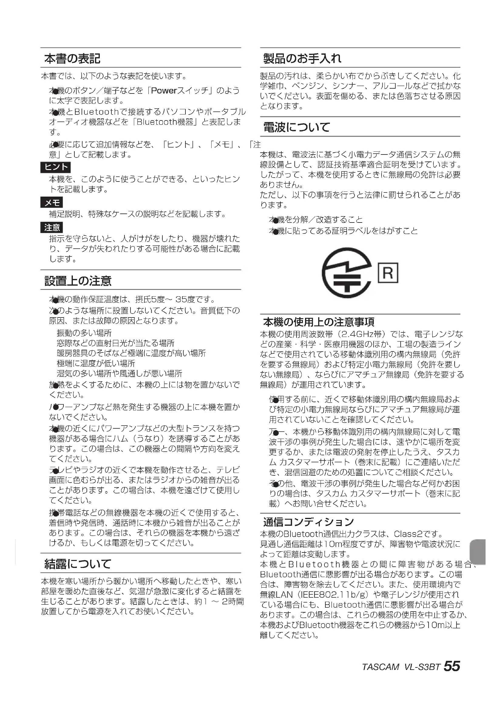 0本機の動作保証温度は、摂氏5度〜 35度です。 0次のような場所に設置しないてください。音質低下の原因、または故障の原因となります。振動の多い場所窓際などの直射日光が当たる場所暖房器具のそばなど極端に温度が高い場所極端に温度が低い場所湿気の多い場所や風通しが悪い場所 0放熱をよくするために、本機の上には物を置かないでください。 0パワーアンプなど熱を発生する機器の上に本機を置かないでください。 0本機の近くにパワーアンプなどの大型トランスを持つ機器がある場合にハム(うなり)を誘導することがあります。この場合は、この機器との間隔や方向を変えてください。 0テレビやラジオの近くで本機を動作させると、テレビ画面に色むらが出る、またはラジオからの雑音が出ることがあります。この場合は、本機を遠ざけて使用してください。 0携帯電話などの無線機器を本機の近くで使用すると、着信時や発信時、通話時に本機から雑音が出ることがあります。この場合は、それらの機器を本機から遠ざけるか、もしくは電源を切ってください。 本機を寒い場所から暖かい場所へ移動したときや、寒い部屋を暖めた直後など、気温が急激に変化すると結露を生じることがあります。結露したときは、約1 〜 2時間放置してから電源を入れてお使いください。 製品の汚れは、柔らかい布でからぶきしてください。化学雑巾、ベンジン、シンナー、アルコールなどで拭かないでください。表面を傷める、または色落ちさせる原因となります。 本機は、電波法に基づく小電力データ通信システムの無線設備として、認証技術基準適合証明を受けています。したがって、本機を使用するときに無線局の免許は必要ありません。ただし、以下の事項を行うと法律に罰せられることがあ 0本機を分解/改造すること 0本機に貼ってある証明ラベルをはがすこと 本機の使用上の注意事項 本機の使用周波数帯(2.4GHz帯)では、電子レンジなどの産業・科学・医療用機器のほか、工場の製造ラインなどで使用されている移動体識別用の構内無線局(免許を要する無線局)および特定小電力無線局(免許を要しない無線局)、ならびにアマチュア無線局(免許を要する無線局)が運用されています。 0使用する前に、近くで移動体識別用の構内無線局および特定の小電力無線局ならびにアマチュア無線局が運用されていないことを確認してください。 0万一、本機から移動体識別用の構内無線局に対して電波干渉の事例が発生した場合には、速やかに場所を変更するか、または電波の発射を停止したうえ、タスカム カスタマーサポート(巻末に記載)にご連絡いただき、混信回避のための処置についてご相談ください。 0その他、電波干渉の事例が発生した場合など何かお困りの場合は、タスカム カスタマーサポート(巻末に記載)へお問い合せください。 本機のBluetooth通信出力クラスは、Class2です。見通し通信距離は10m程度ですが、障害物や電波状況によって距離は変動します。本機とBluetooth機器との間に障害物がある場合、Bluetooth通信に悪影響が出る場合があります。この場合は、障害物を除去してください。また、使用環境内で無線LAN(IEEE802.11b/g)や電子レンジが使用されている場合にも、Bluetooth通信に悪影響が出る場合があります。この場合は、これらの機器の使用を中止するか、本機およびBluetooth機器をこれらの機器から10m以上離してください。56