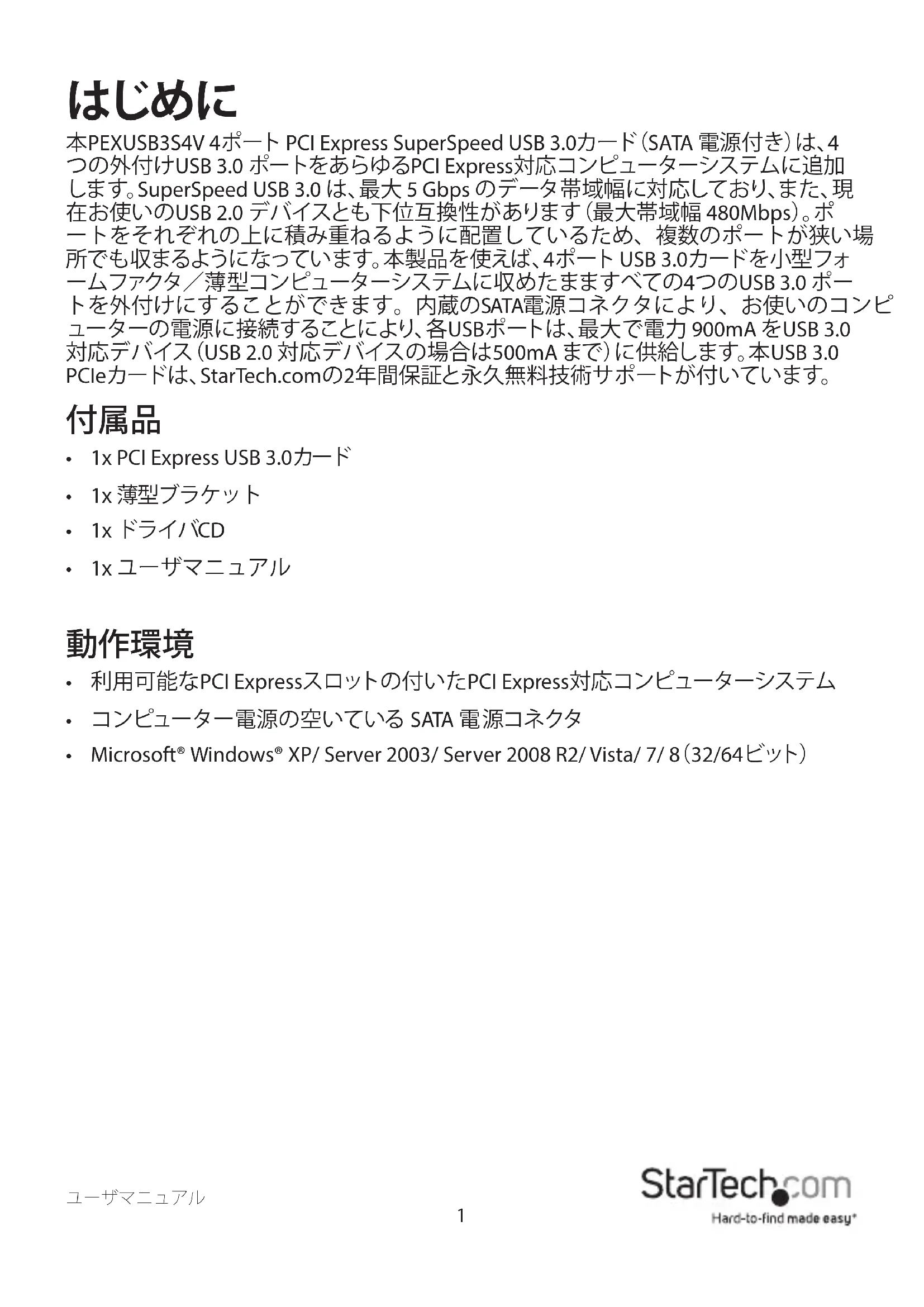 本PEXUSB3S4V 4ポ ート PCI Express SuperSpeed USB 3.0カ ー ド( SATA 電源付き)は、4 つの外付けUSB 3.0 ポートをあらゆるPCI Express対応コンピューターシステムに追加 します。SuperSpeed USB 3.0 は 、最 大 5 Gbps のデータ帯域幅に対応しており、また、現 在お使いのUSB 2.0 デバイスとも下位互換性があります(最大帯域幅 480Mbps)。ポ ートをそれぞれの上に積み重ねるように配置しているため、複数のポートが狭い場 所でも収まるようになっています。本製品を使えば、4ポ ート USB 3.0カード を 小 型 フォ ームファクタ/薄型コンピューターシステムに収めたまますべての4つのUSB 3.0 ポー トを外付けにすることができます。内蔵のSATA電源コネクタにより、お使いのコンピ ューターの電源に接続することにより、各USBポートは、最大で電力 900mA をUSB 3.0 対応デバイス(USB 2.0 対応デバイスの場合は500mA ま で )に 供 給 し ま す 。本 USB 3.0 PCIeカードは、StarTech.comの2年間保証と永久無料技術サポートが付いています。