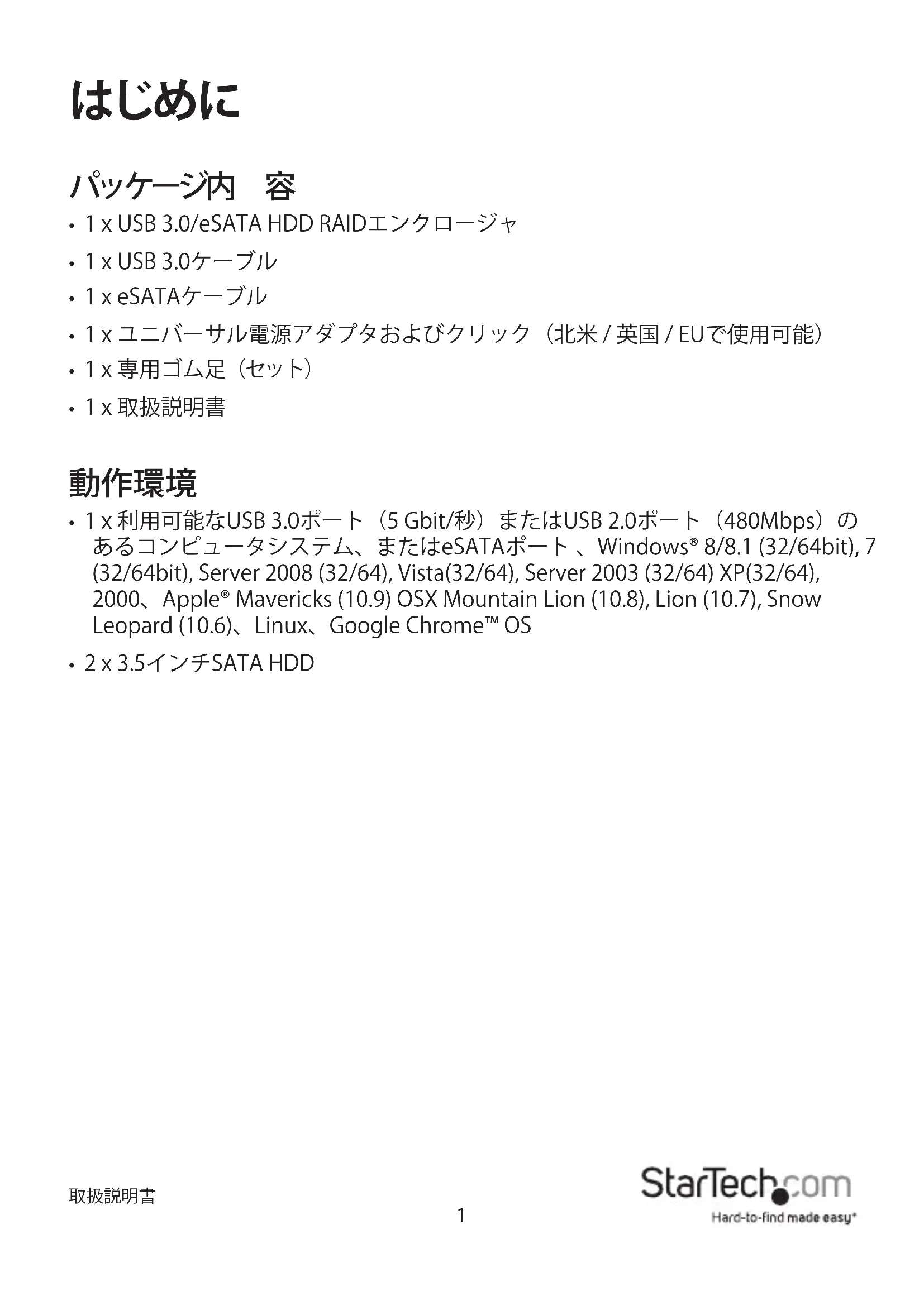 - 1x利用可能的USB3.0亜一ト(5Gbit/秒)またはUSB2.0亜一ト(480Mbps)のあるコンビューナステム、またはeSATA亜一ト、Windows®8/8.1(32/64bit),7(32/64bit),Server2008(32/64),Vista(32/64),Server2003(32/64)XP(32/64),2000、Apple®Mavericks(10.9)OSXMountain Lion(10.8),Lion(10.7),SnowLeopard(10.6)、Linux、Google Chrome™OS