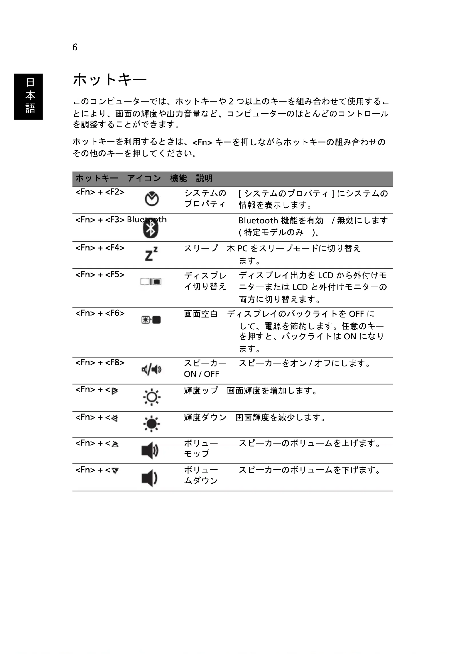 ON / OFF ケヌーィーをアン / アネ <Fn> + < > 輝度゚セハ 画面輝度を増加 <Fn> + < > 輝度ジゞン 画面輝度を減少 <Fn> + < >