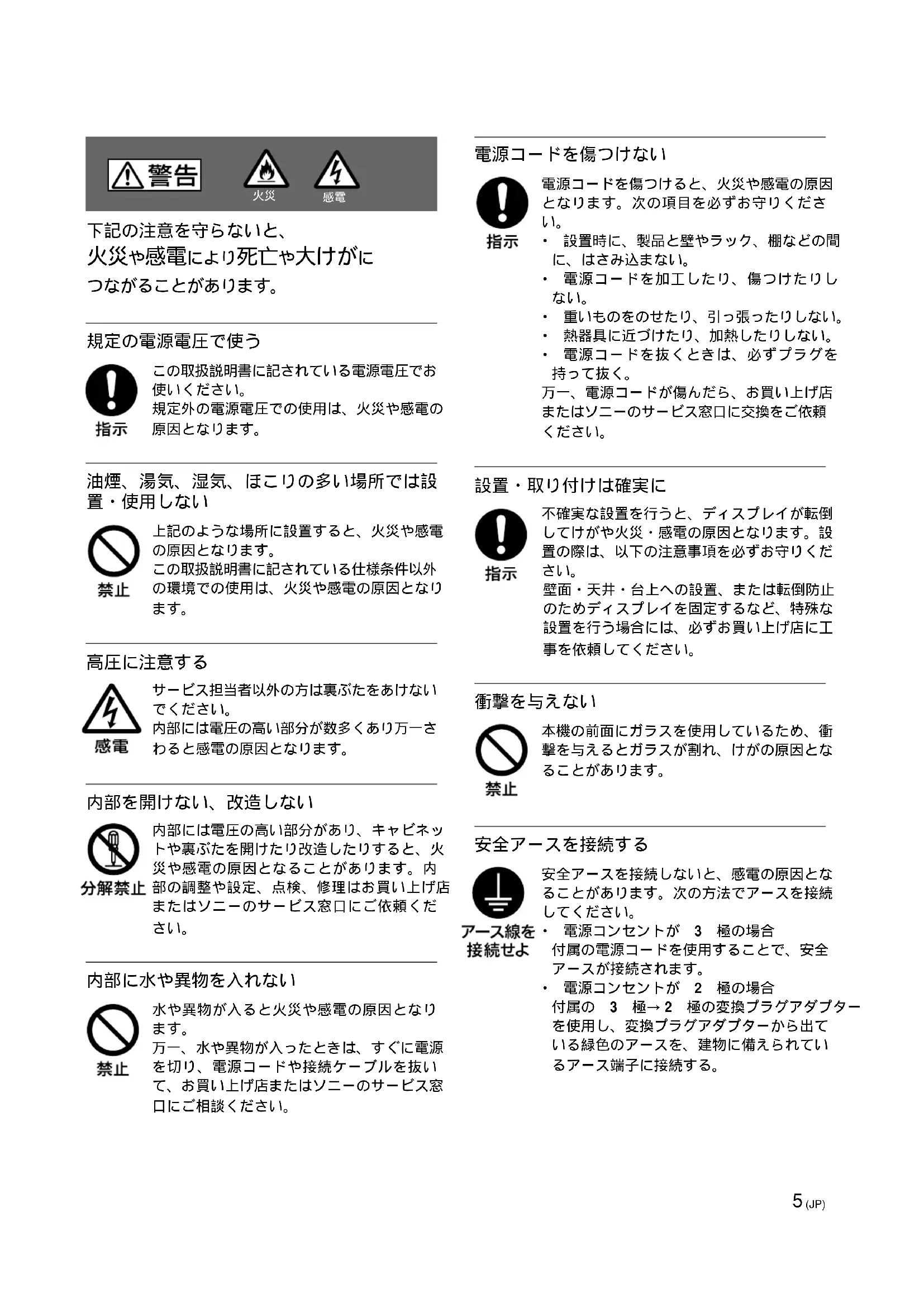 - (JP) 保証書とアフターサービス (JP)5 (JP) 下記の注意を守らないと、 火災や感電により死亡や大けがに つながることがあります。 p. 53