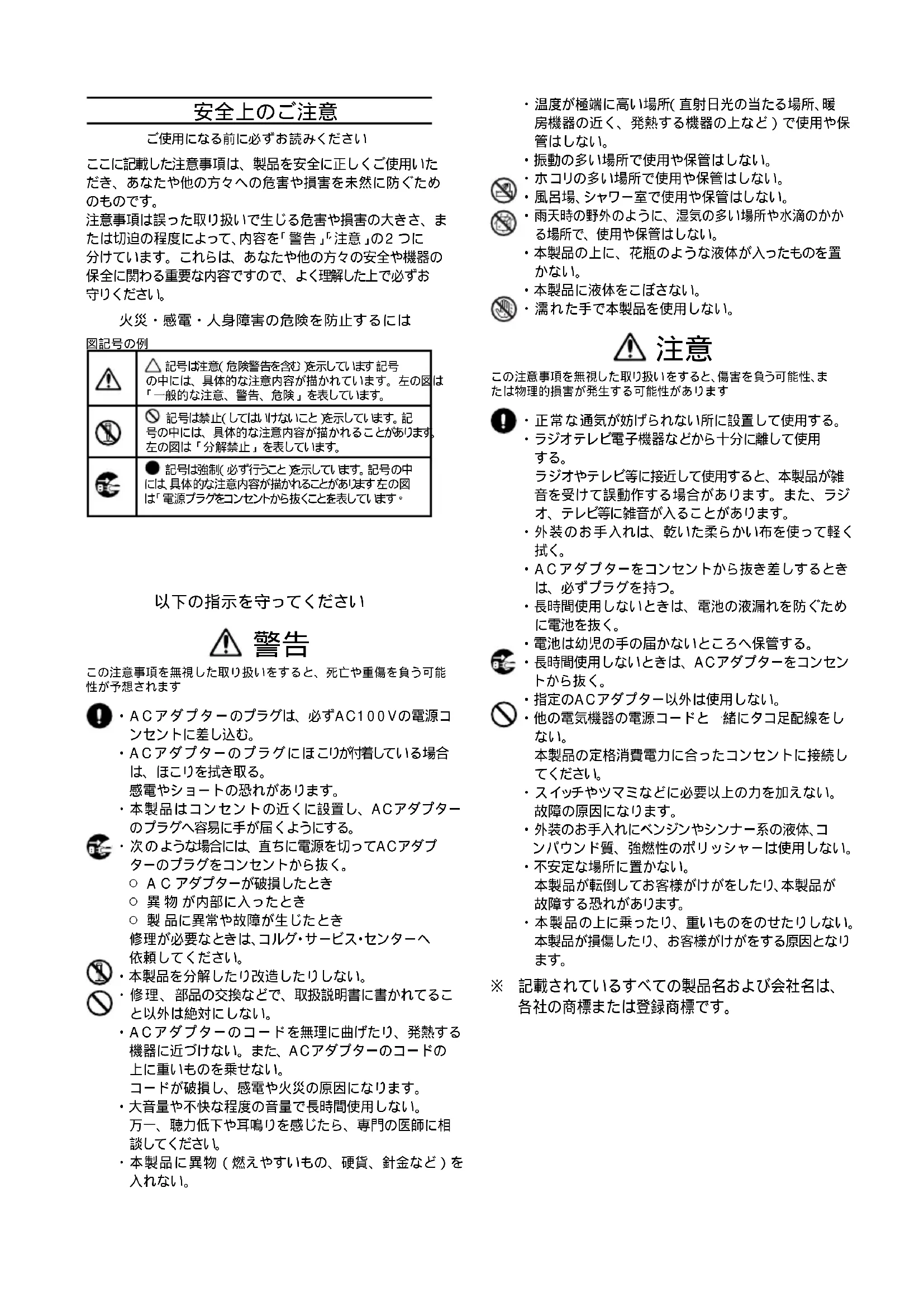 ・本製品を分解したり改造したりしない。 ・修理、部品の交換などで、取扱説明書に書かれてるこ と以外は絶対にしない。 ・ACアダプターのコードを無理に曲げたり、発熱する 機器に近づけない。また、ACアダプターのコードの 上に重いものを乗せない。 コードが破損し、感電や火災の原因になります。 ・大音量や不快な程度の音量で長時間使用しない。 万一、聴力低下や耳鳴りを感じたら、専門の医師に相