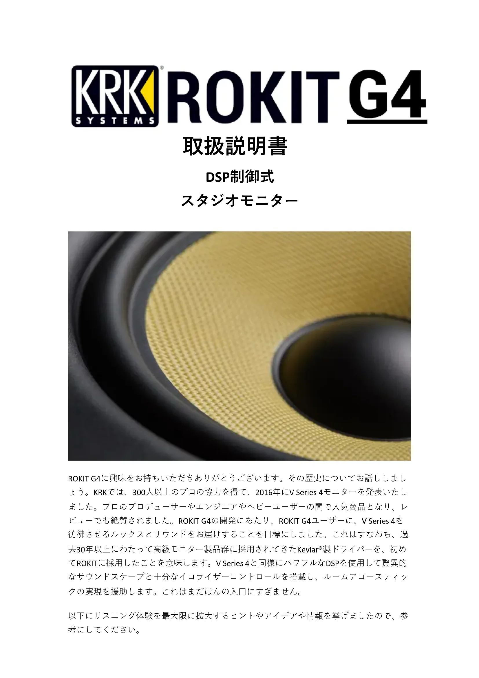 ROKIT G4に興味をお持ちいただきありがとうございます。その歴史についてお話ししまし ょう。KRKでは、300人以上のプロの協力を得て、2016年にV Series 4モニターを発表いたし ました。プロのプロデューサーやエンジニアやヘビーユーザーの間で人気商品となり、レ ビューでも絶賛されました。ROKIT G4の開発にあたり、ROKIT G4ユーザーに、V Series 4を 彷彿させるルックスとサウンドをお届けすることを目標にしました。これはすなわち、過 去30年以上にわたって高級モニター製品群に採用されてきたKevlar®製ドライバ―を、初め てROKITに採用したことを意味します。V Series 4と同様にパワフルなDSPを使用して驚異的 なサウンドスケープと十分なイコライザーコントロールを搭載し、ルームアコースティッ クの実現を援助します。これはまだほんの入口にすぎません。 以下にリスニング体験を最大限に拡大するヒントやアイデアや情報を挙げましたので、参 考にしてください。スタジオルームの配置と設定。 KRKのデザインチームでは、調整が最小限で済む利用価値のきわめて高いイコライザーツ ールを提供することができるように、数百種類のスタジオモニターの配置とルームアコー スティック条件をモデル化して分析する努力を払いました。いまだに完璧なスタジオルー ムを建設することはできないため、現代のスタジオで最も大きな問題はルームアコーステ ィックです。著名スタジオの大部分は一般家屋を改造したものです。弊社では、こうした 条件から生じる不完全性を補正するコントロールを提供しています。