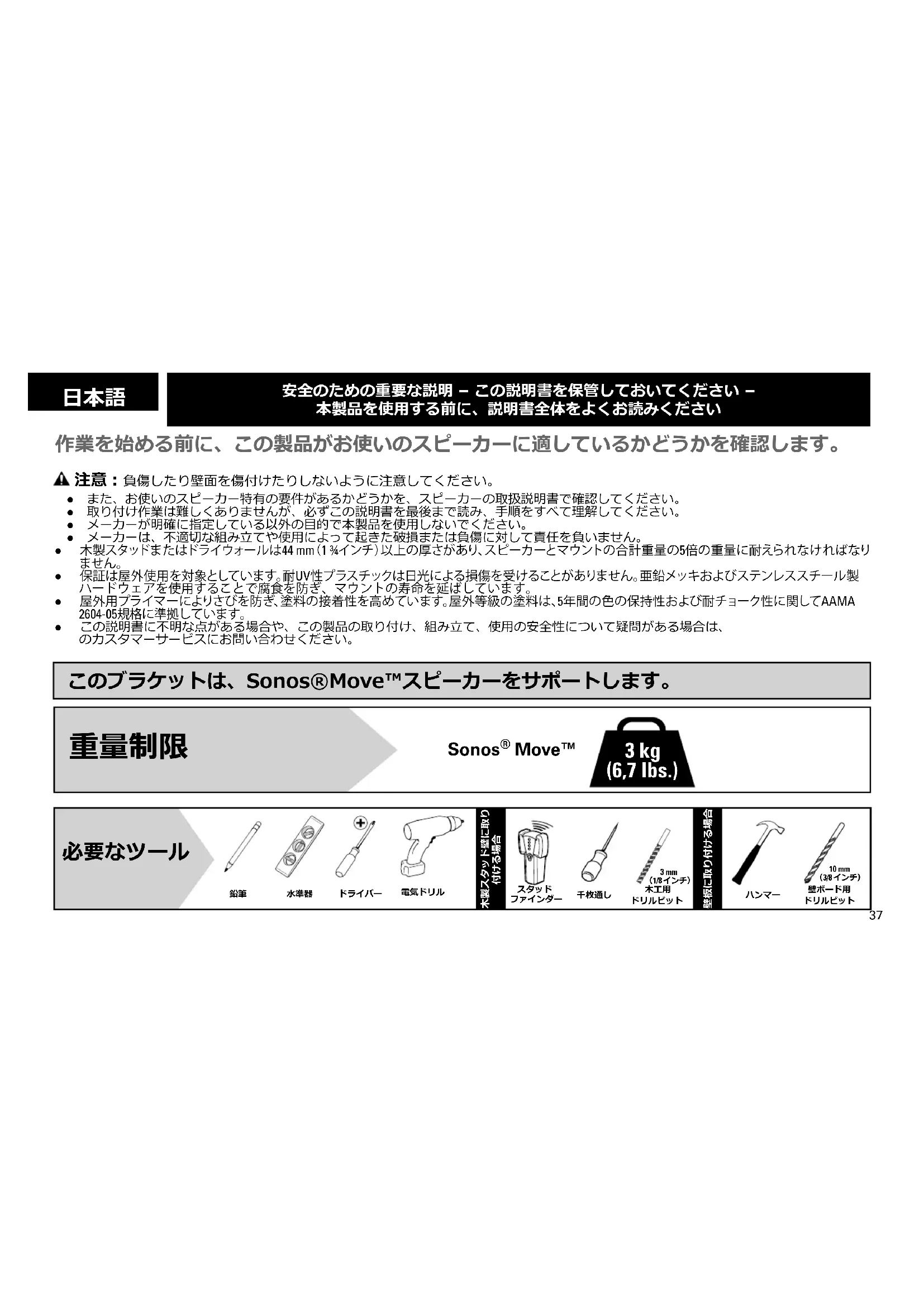 安全のための重要な説明 – この説明書を保管しておいてください – 本製品を使用する前に、説明書全体をよくお読みください このブラケットは、Sonos®Move™スピーカーをサポートします。 ● また、お使いのスピーカー特有の要件があるかどうかを、スピーカーの取扱説明書で確認してください。 ● 取り付け作業は難しくありませんが、必ずこの説明書を最後まで読み、手順をすべて理解してください。 ● メーカーが明確に指定している以外の目的で本製品を使用しないでください。 ● メーカーは、不適切な組み立てや使用によって起きた破損または負傷に対して責任を負いません。 ● 木製スタッドまたはドライウォールは44 mm(1 ¾インチ)以上の厚さがあり、スピーカーとマウントの合計重量の5倍の重量に耐えられなければなり