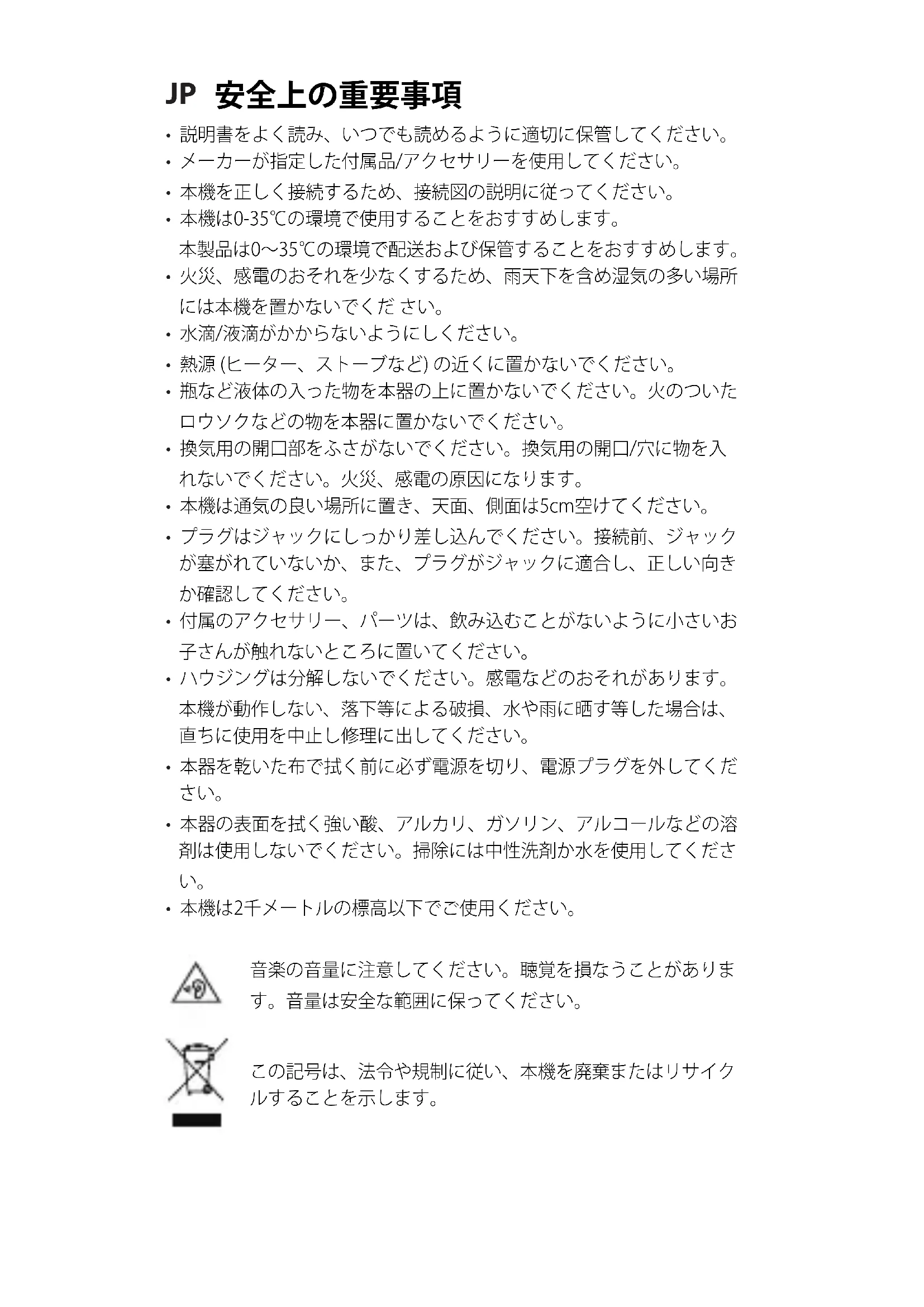 - 本機は2千メートルの標高以下でご使用ください。 音楽の音量に注意してください。聴覚を損なうことがありま す。音量は安全な範囲に保ってください。 この記号は、法令や規制に従い、本機を廃棄またはリサイク ルすることを示します。ワイヤレス製品の場合: