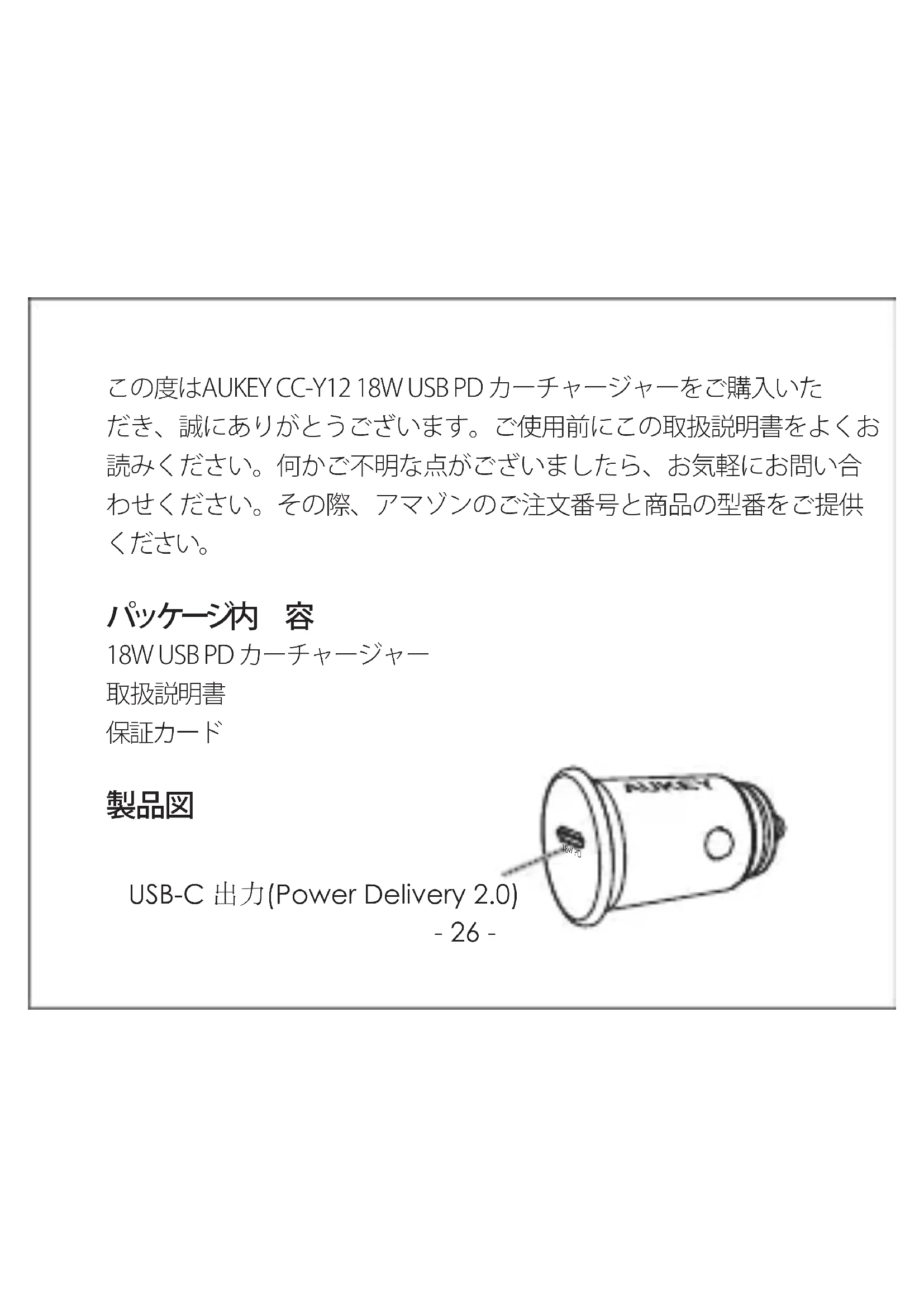 AmazonUSorders:support.us@aukey.com AmazonEUorders:support.eu@aukey.com AmazonCAorders:support.ca@aukey.com AmazonJPorders:support.jp@aukey.com *当社がAUKEYから購入した製品に対してのみ、アフターサービスと製品保証 を提供しております。他の小売業者から購入された製品の交換、返品、返金に 関しましては購入先へお問い合わせお願いします。AUKEY International Ltd. www.aukey.com | support@aukey.com No.102, Building P09, Electronics Trade Center Huanan City, Pinghu Town, Longgang District Shenzhen, Guangdong, 518111, CN Made in China Model: CC-Y12