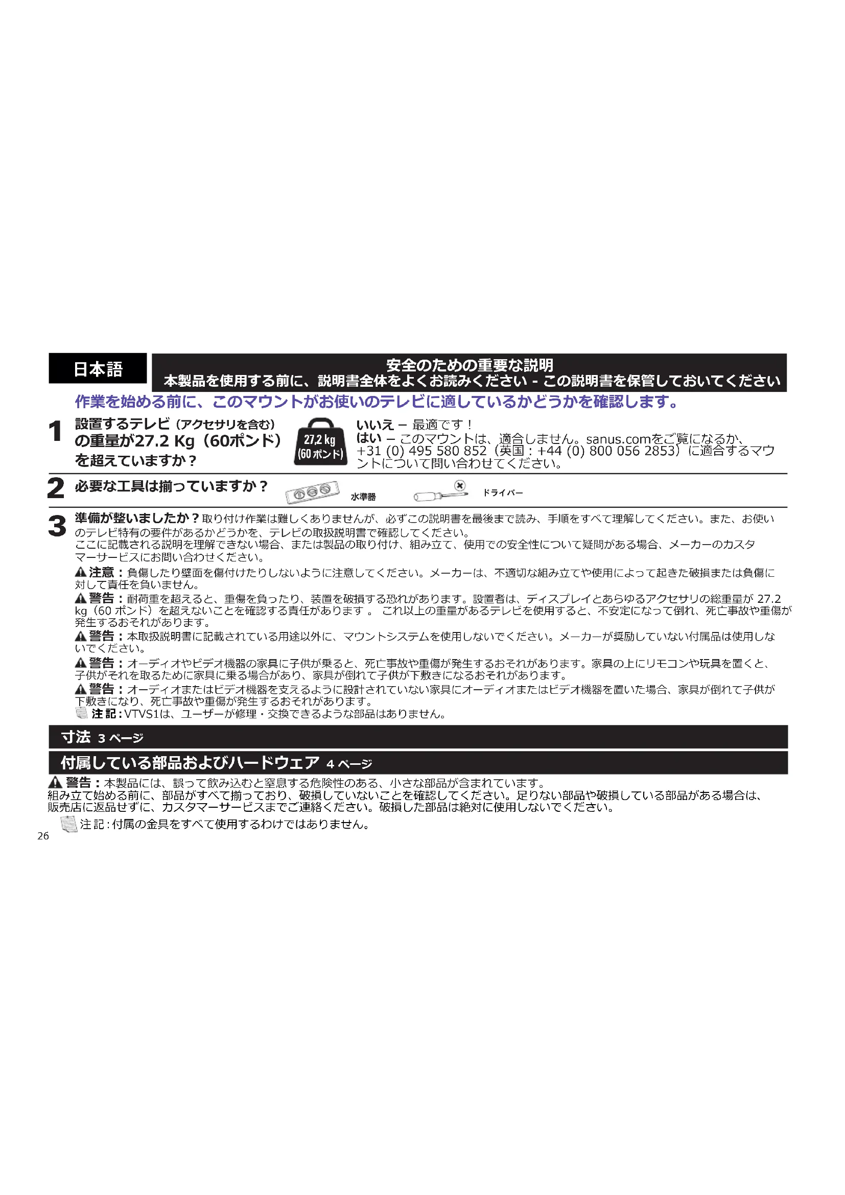 このマウントは、適合しません。sanus.comをご覧になるか、 +31 (0) 495 580 852(英国:+44 (0) 800 056 2853)に適合するマウ ントについて問い合わせてください。 準備が整いましたか?取り付け作業は難しくありませんが、必ずこの説明書を最後まで読み、手順をすべて理解してください。また、お使い のテレビ特有の要件があるかどうかを、テレビの取扱説明書で確認してください。ここに記載される説明を理解できない場合、または製品の取り付け、組み立て、使用での安全性について疑問がある場合、メーカーのカスタ マーサービスにお問い合わせください。 注意:負傷したり壁面を傷付けたりしないように注意してください。メーカーは、不適切な組み立てや使用によって起きた破損または負傷に 対して責任を負いません。 警告:耐荷重を超えると、重傷を負ったり、装置を破損する恐れがあります。設置者は、ディスプレイとあらゆるアクセサリの総重量が 27.2 kg(60 ポンド)を超えないことを確認する責任があります 。 これ以上の重量があるテレビを使用すると、不安定になって倒れ、死亡事故や重傷が発生するおそれがあります。 警告:本取扱説明書に記載されている用途以外に、マウントシステムを使用しないでください。メーカーが奨励していない付属品は使用しな 警告:オーディオやビデオ機器の家具に子供が乗ると、死亡事故や重傷が発生するおそれがあります。家具の上にリモコンや玩具を置くと、 子供がそれを取るために家具に乗る場合があり、家具が倒れて子供が下敷きになるおそれがあります。 警告:オーディオまたはビデオ機器を支えるように設計されていない家具にオーディオまたはビデオ機器を置いた場合、家具が倒れて子供が 下敷きになり、死亡事故や重傷が発生するおそれがあります。 注 記:VTVS1は、ユーザーが修理・交換できるような部品はありません。