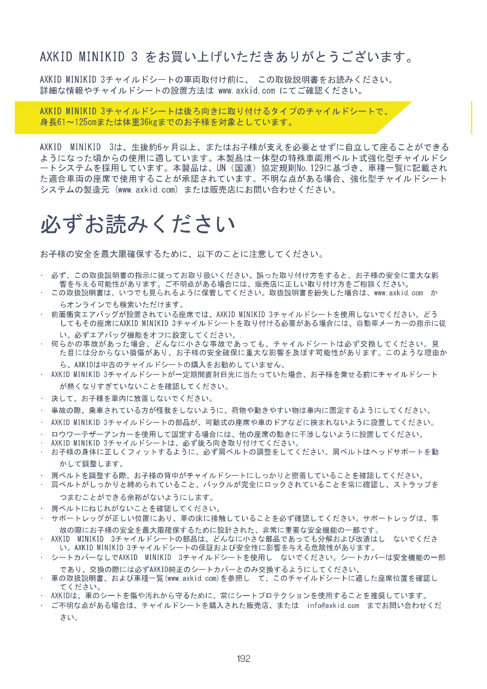 - .(A) . 192 AXKID MINIKID 3 をお買い上げいただきありがとうございます。 AXKID MINIKID 3チャイルドシートの車両取付け前に、 この取扱説明書をお読みください。 詳細な情報やチャイルドシートの設置方法は www.axkid.com にてご確認ください。 AXKID MINIKID 3チャイルドシートは後ろ向きに取り付けるタイプのチャイルドシートで、 身長61~125cmまたは体重36kgまでのお子様を対象としています。 AXKID MINIKID 3は、生後約6ヶ月以上、またはお子様が支えを必要とせずに自立して座ることができる ようになった頃からの使用に適しています。本製品は一体型の特殊車両用ベルト式強化型チャイルドシ ートシステムを採用しています。本製品は、UN(国連)協定規則No.129に基づき、車種一覧に記載され た適合車両の座席で使用することが承認されています。不明な点がある場合、強化型チャイルドシート システムの製造元 (www.axkid.com) または販売店にお問い合わせください。
