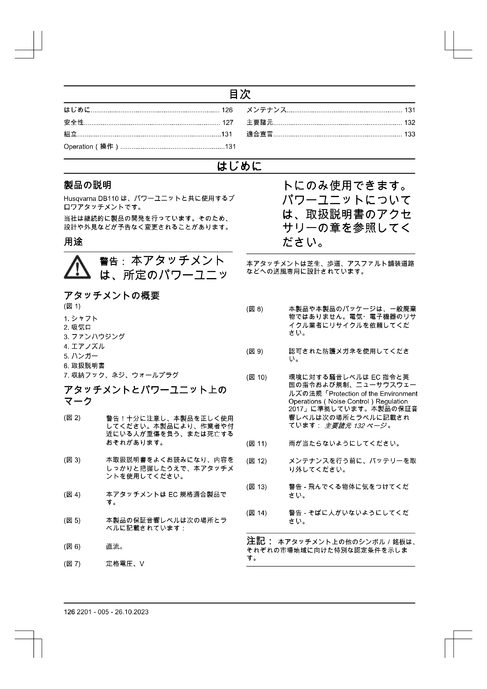 132 2201 - 005 - 26.10.2023適合宣言 EU 適合宣言 ハスクバーナ社(Husqvarna AB, SE-561 82 Huskvarna, Sweden、電話番号:+46-36-146500)は、単独責任のも とで、以下の製品の適合を宣言します。 名称 バッテリー式ブロワ ブランド Husqvarna タイプ/モデル パワーユニット 110iLD または 110iL 付き DB110 アタッチメント ID 2023 年以降の製造番号 が以下の EU 指令および規制を完全に順守し、