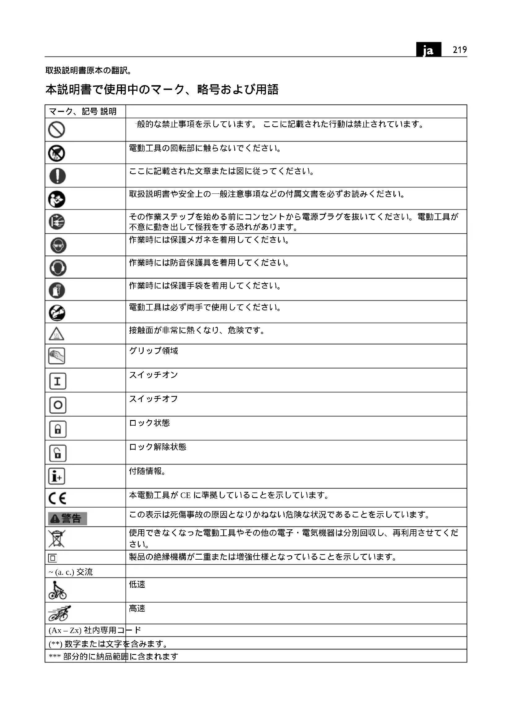 本電動工具が CE に準拠していることを示しています。 この表示は死傷事故の原因となりかねない危険な状況であることを示しています。 使用できなくなった電動工具やその他の電子・電気機器は分別回収し、再利用させてくだ