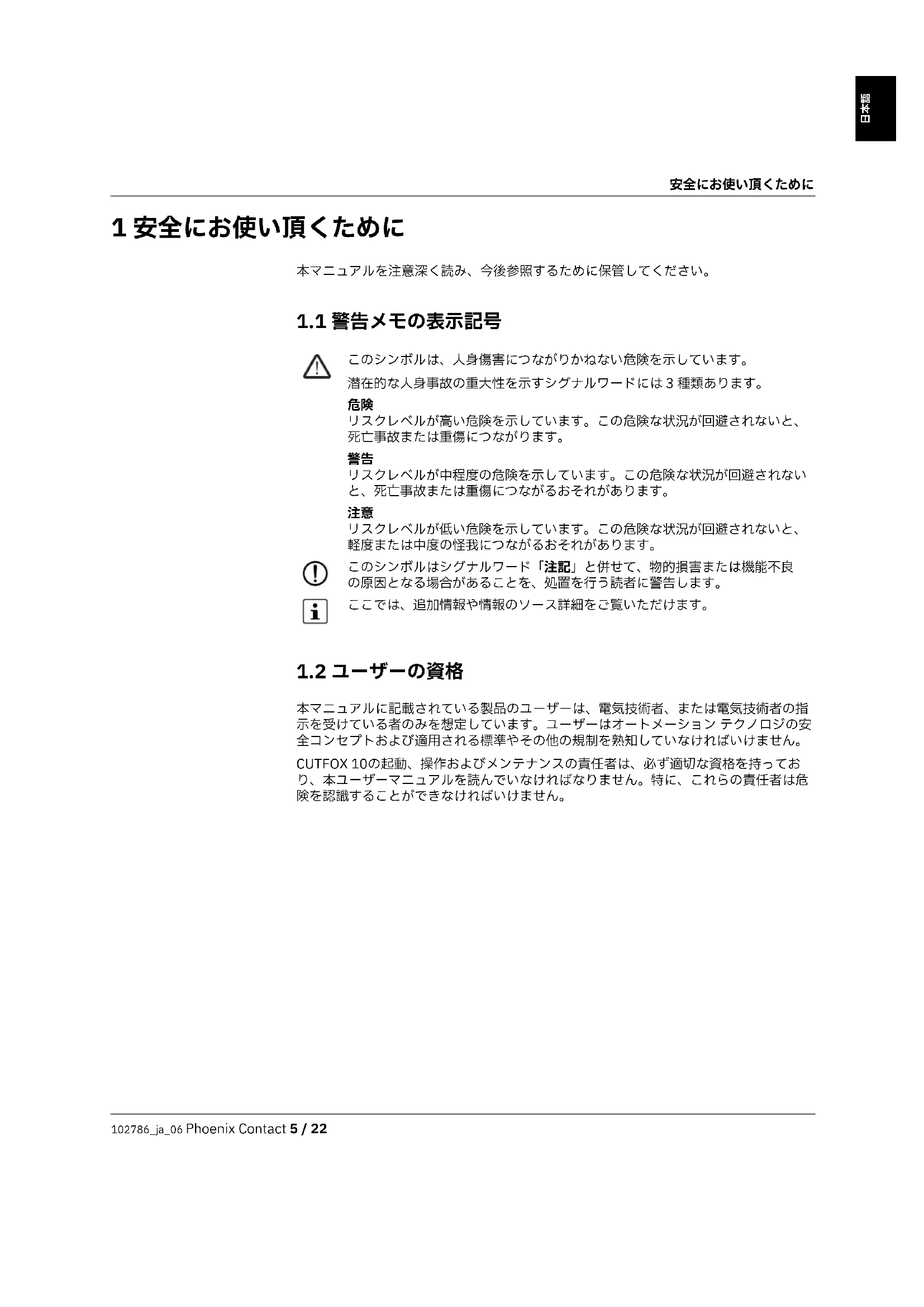前扉は操作者の安全のために取り付けられています。いかなる状況においても、この扉 を変更したり、取り外したり、または改造してブリッジしてはいけません。 CUTFOX 10は前扉が閉じた状態でのみ操作できます。 メンテナンス作業を始める前に、主電源プラグを抜いてください。 ハウジング内に異物が入り込んでいないか確認してください。 交換部品はPhoenix Contactの純正部品のみをお使いください。 機器のハードウェアおよびファームウェアに変更を加えることは許可されていません。 不正な操作や機器の改造により、安全が損なわれたり機器が損傷したりするおそれがあ ります。機器の修理は自分では行わないでください。機器が故障している場合は、 Phoenix Contact にご連絡ください。操作CUTFOX 10 102786_ja_06 Phoenix Contact 7 / 22