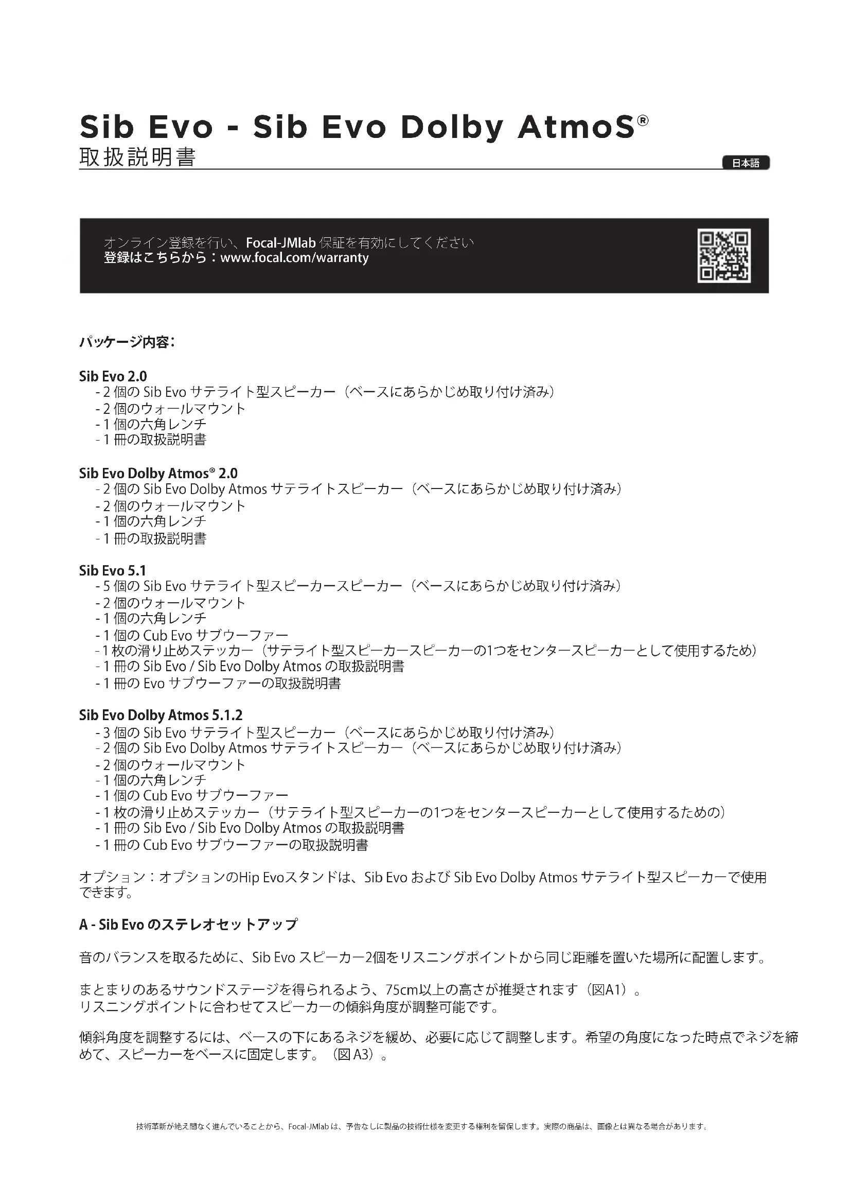 パ ッケ ー ジ 内 容: Sib Evo 2.0 -2個のSibEvoサテライト型スピーカー(ベースにあらかじめ取り付け済み) -2個のウォールマウント -1個の六角レンチ -1冊の取扱説明書 Sib Evo Dolby Atmos® 2.0 -2個のSibEvoDolbyAtmosサテライトスピーカー(ベースにあらかじめ取り付け済み) -2個のウォールマウント -1個の六角レンチ -1冊の取扱説明書 Sib Evo 5.1 -5個のSibEvoサテライト型スピーカースピーカー(ベースにあらかじめ取り付け済み) -2個のウォールマウント -1個の六角レンチ -1個のCubEvoサブウーファー -1枚の滑り止めステッカー(サテライト型スピーカースピーカーの1つをセンタースピーカーとして使用するため) -1冊のSibEvo/SibEvoDolbyAtmosの取扱説明書 -1冊のEvoサブウーファーの取扱説明書 Sib Evo Dolby Atmos 5.1.2 -3個のSibEvoサテライト型スピーカー(ベースにあらかじめ取り付け済み) -2個のSibEvoDolbyAtmosサテライトスピーカー(ベースにあらかじめ取り付け済み) -2個のウォールマウント -1個の六角レンチ -1個のCubEvoサブウーファー -1枚の滑り止めステッカー(サテライト型スピーカーの1つをセンタースピーカーとして使用するための) -1冊のSibEvo/SibEvoDolbyAtmosの取扱説明書 -1冊のCubEvoサブウーファーの取扱説明書 オプション:オプションのHipEvoスタンドは、SibEvoおよびSibEvoDolbyAtmosサテライト型スピーカーで使用