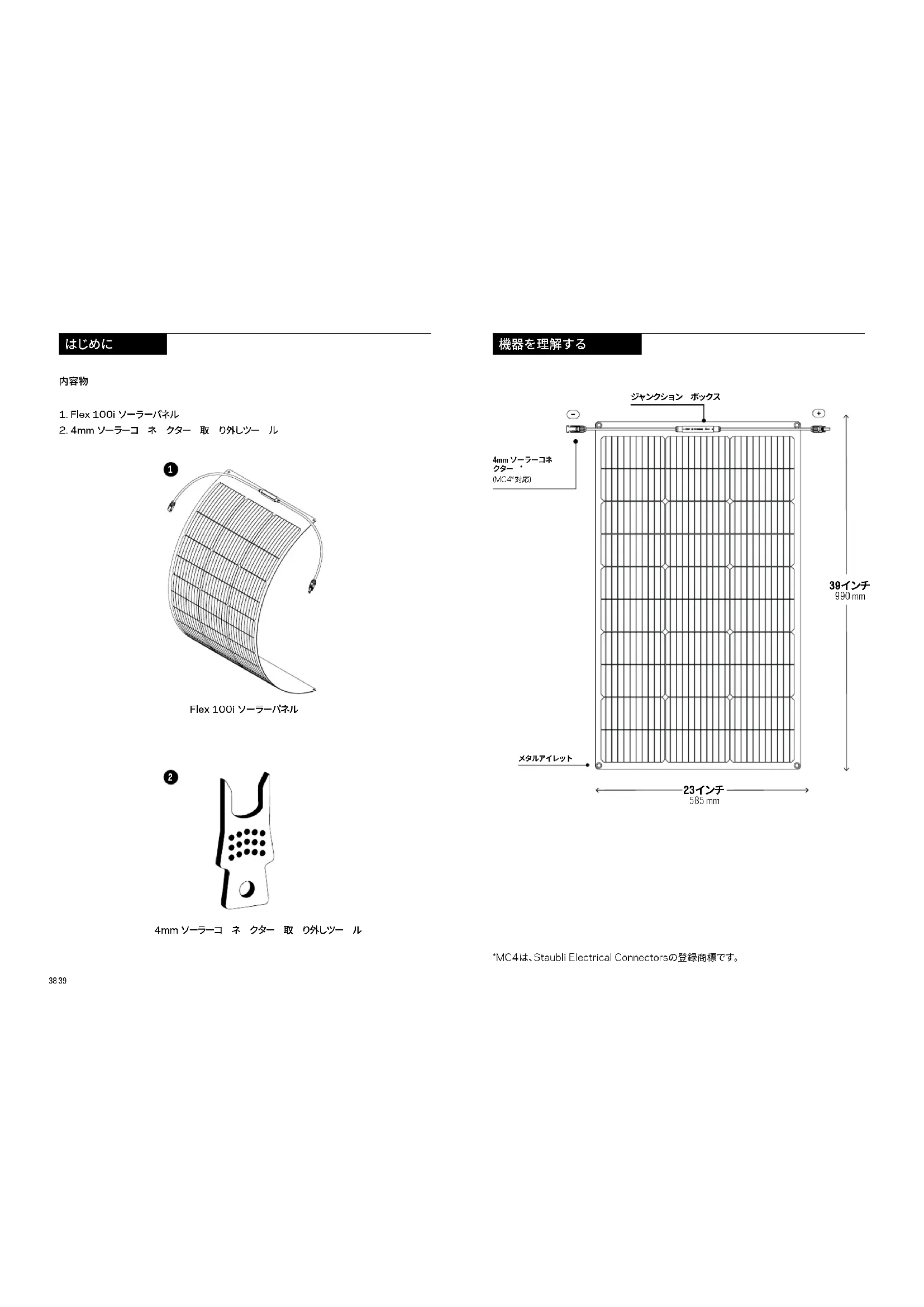 ソーラーパネルは何枚まで接続できますか? パネルをペアリングしているデバイスによって異なります。たとえば、Goal Zero Yeti 4000 PROは最大5枚のFlex 100iパネルを直列に収容できますが、Yeti 1500Xおよ び他のすべての「X」ライン製品は2枚のパネルしか直列に収容できません。 Flex 100iにサードパーティのソーラーパネルを接続できますか? いいえ。Flex 100iの他のメーカーの製品との互換性は保証されていません。多くのソー ラーパネルは異なる方法で製造されています。Flex 100iをサ ードパ ー ティ製 パ ネル と 組み合わせると、製品の損傷、火災、その他の重大な問題が発生する可能性があります。 Flex 100iはどの程度柔軟性がありますか? Flex 100i は、縦方向に最も柔軟です。この方向には半径0.4 mで曲 げることができま す 。パ ネ ル を 0.4mよりも小さい半径で強制的に曲げると、パネルに永続的な損傷が生じ る可能性があります。パネルを使用していて、柔軟性が最大限に達していると思われる 場合は、それ以上無理に曲げないでください。