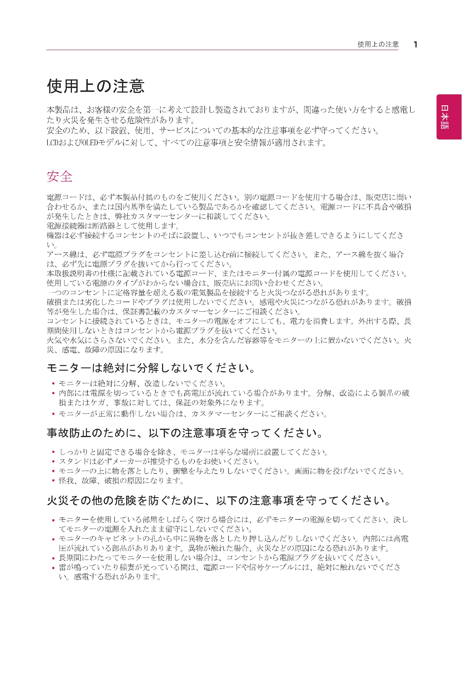 本製品は、お客様の安全を第一に考えて設計し製造されておりますが、間違った使い方をすると感電し たり火災を発生させる危険性があります。安全のため、以下設置、使用、サービスについての基本的な注意事項を必ず守ってください。 LCDおよびOLEDモデルに対して、すべての注意事項と安全情報が適用されます。 電源コードは、必ず本製品付属のものをご使用ください。別の電源コードを使用する場合は、販売店に問い合わせるか、または国内基準を満たしている製品であるかを確認してください。電源コードに不具合や破損が発生したときは、弊社カスタマーセンターに相談してください。電源接続器は断路器として使用します。機器は必ず接続するコンセントのそばに設置し、いつでもコンセントが抜き差しできるようにしてくださ アース線は、必ず電源プラグをコンセントに差し込む前に接続してください。また、アース線を抜く場合は、必ず先に電源プラグを抜いてから行ってください。本取扱説明書の仕様に記載されている電源コード、またはモニター付属の電源コードを使用してください。使用している電源のタイプがわからない場合は、販売店にお問い合わせください。一つのコンセントに定格容量を超える数の電気製品を接続すると火災つながる恐れがあります。破損または劣化したコードやプラグは使用しないでください。感電や火災につながる恐れがあります。破損等が発生した場合は、保証書記載のカスタマーセンターにご相談ください。コンセントに接続されているときは、モニターの電源をオフにしても、電力を消費します。外出する際、長期間使用しないときはコンセントから電源プラグを抜いてください。火気や水気にさらさないでください。また、水分を含んだ容器等をモニターの上に置かないでください。火災、感電、故障の原因になります。 モニターは絶対に分解しないでください。