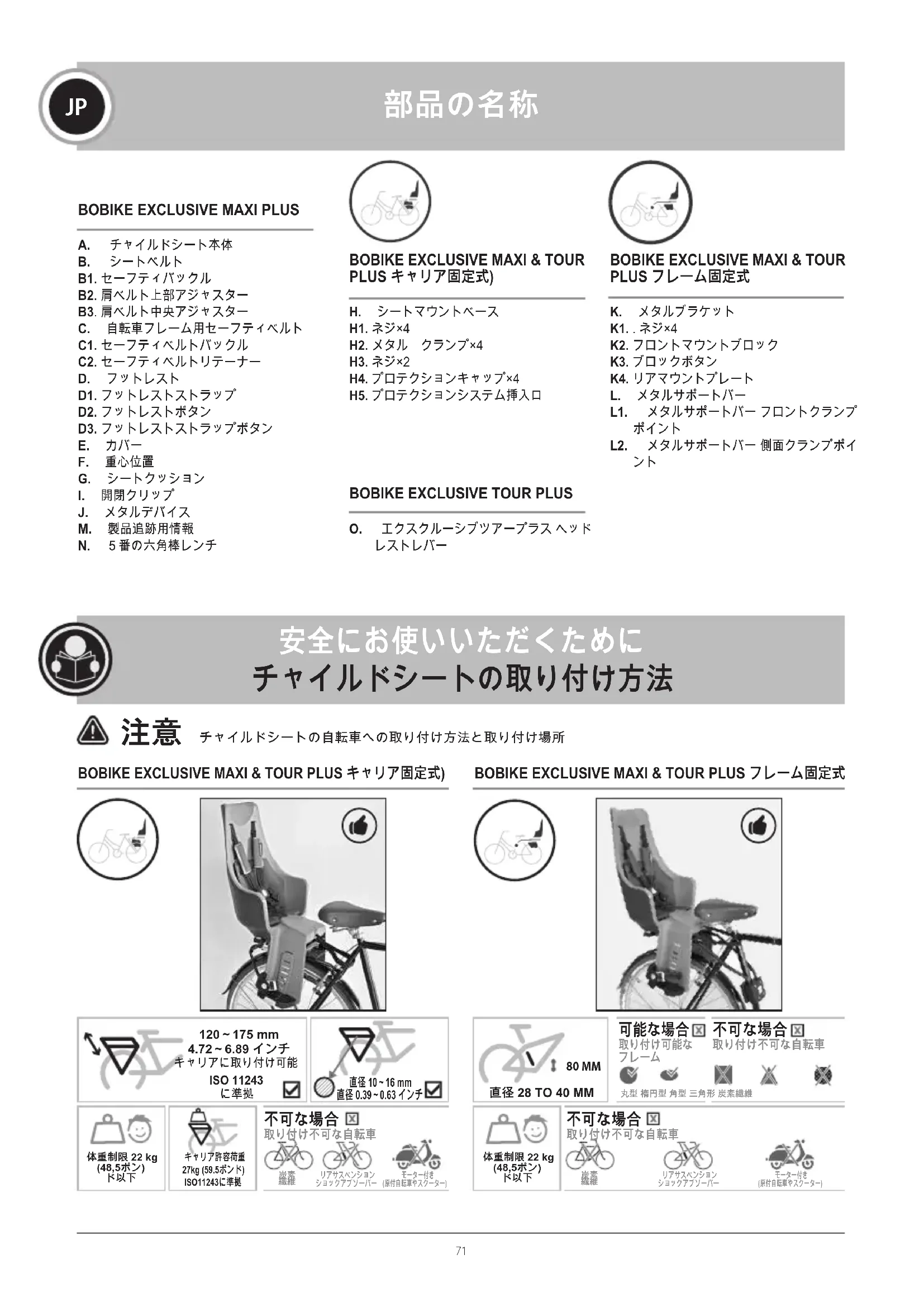 - 安全性の理由から、本チャイルドシートは、ISO規格11243 に従った幅120mmから175mmのキャリアにのみご使用くださ