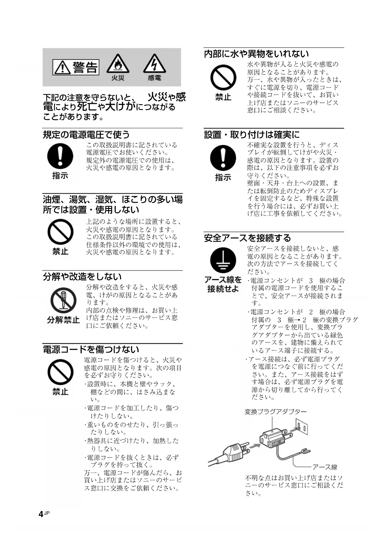 万一、電源コードが傷んだら、お 買い上げ店またはソニーのサービ ス窓口に交換をご依頼ください。 内部に水や異物をいれない 水や異物が入ると火災や感電の 原因となることがあります。 万一、水や異物が入ったときは、 すぐに電源を切り、電源コード や接続コードを抜いて、お買い 上げ店またはソニーのサービス 窓口にご相談ください。 設置・取り付けは確実に 不確実な設置を行うと、ディス プレイが転倒してけがや火災・ 感電の原因となります。設置の 際は、以下の注意事項を必ずお