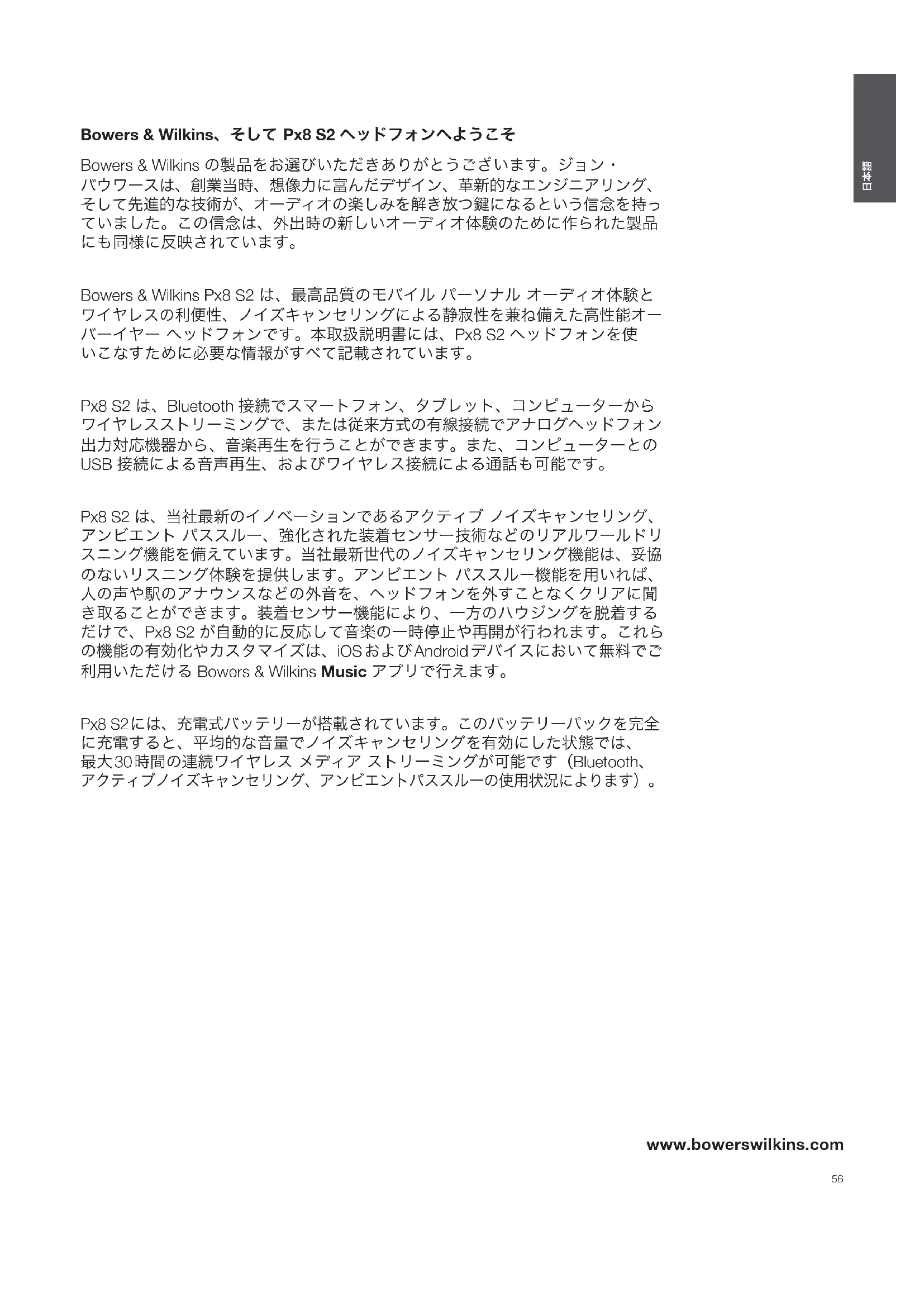 www.bowerswilkins.com Bowers & Wilkins、そして Px8 S2 ヘッドフォンへようこそ Bowers & Wilkins の製品をお選びいただきありがとうございます。ジョン・ バウワースは、創業当時、想像力に富んだデザイン、革新的なエンジニアリング、 そして先進的な技術が、オーディオの楽しみを解き放つ鍵になるという信念を持っ ていました。この信念は、外出時の新しいオーディオ体験のために作られた製品 にも同様に反映されています。