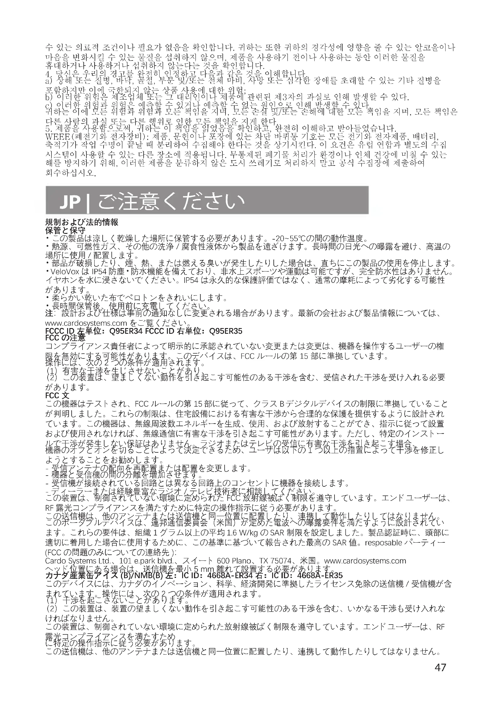 管轄区域内の適用される法律および規制に従い、お客様の製品は、最初の購入日から 2 年間の制限付き製品保 証の対象となります。購入証明のために小売売上レシートと登録データを保持して提出してください。 いかなる場合でも、カルドは、この製品の使用、誤用、使用不能、または製品の欠陥に起因するかどうかにか かわらず、偶発的、特別、間接的、懲罰的、例示的または結果的な損害について責任を負いません。契約違反、 不法行為 ( 過失を含む )、製品責任、またはそのような損害の可能性が通知された場合でも、製品の使用に起因 する損害について。あなた 上記の制限が、お客様が同意する本契約の基本的な要素であり、そのような制限がないと製品がお客様に提供 されないことを認め、同意します。Cardo は、デバイスまたはソフトウェアを修理または交換する ( 新しいまた は新しく改装された交換製品と )、または独自の裁量で購入価格の返金を与える独占的権利を保持します。その ような救済策は、保証違反に対するお客様の唯一かつ排他的な救済策となります。 カルドは、上記の条件を条件として、本製品に材料または仕上がりに欠陥がないことを保証することをここに 表します。対象期間内に、Cardo は、製品の通常の使用による水害を含む、通常の使用中に故障したコンポーネ ントを独自の選択で修理または交換します。そのような修理または交換は、部品または人件費について顧客に 無料で行われますが、顧客は公式当局への送料および適用される料金を負担するものとします。この保証は、 乱用、誤用、事故、紛失、不正な変更または修理による故障をカバーしません。 本製品は、通信およびエンターテインメント機器としてのみ使用することを目的としており、使用が禁止され ている場所または管轄区域で使用するべきではありません。 本明細書に含まれる保証および救済策は排他的であり、商品性または特定の目的への適合性の保証、法定また はカルドが特に否認するその他の責任に基づいて生じる責任を含む、明示的、黙示的、または法定的な他のす べての保証の代わりになります。この保証は、管轄区域によって異なる可能性のある特定の法的権利を与えます。 Cardo は、ここで具体的に記載されているもの以外の明示的または黙示的な保証を行いません。この保証は、元 49の購入者のみにカルドによって拡張され、他人に譲渡または譲渡することはできません。Cardo は、書面で行わ れ、会社の役員が署名した場合を除き、この保証の追加または変更について一切の義務または責任を負いません。 バッテリー容量が定格容量の 50% を下回る場合、またはバッテリーが漏れた場合にのみバッテリーが保証され ます。バッテリーの容量に不可逆的な損傷を与える可能性があるため、6 ヶ月を超える期間は、時々充電せずに 製品を保管しないでください。保証はそのようなイベントをカバーしません。この保証は、a) ケースまたはバッ テリーのシールが壊れているか、製品またはバッテリーに改ざんの兆候がある場合、b) バッテリーが目的の機 器以外の機器に使用されている場合も無効になります。c) 製品が目的に違反して使用されている。d) オンライ ンオークションから購入した製品 Cardo は、Cardo 以外のコンポーネント、アクセサリー、またはデバイスを製品と組み合わせて使用したことに 起因する責任を負いません。 注意:バッテリーを間違ったタイプに交換した場合、爆発の危険性があるため、バッテリーを改ざんしないで