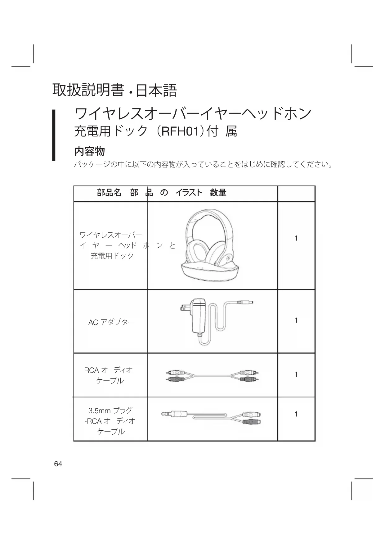 llame al servicio de atención al cliente al 1-866-216-1072.64 ワイヤレスオーバーイヤーヘッドホン 充電用ドック(RFH01)付 属