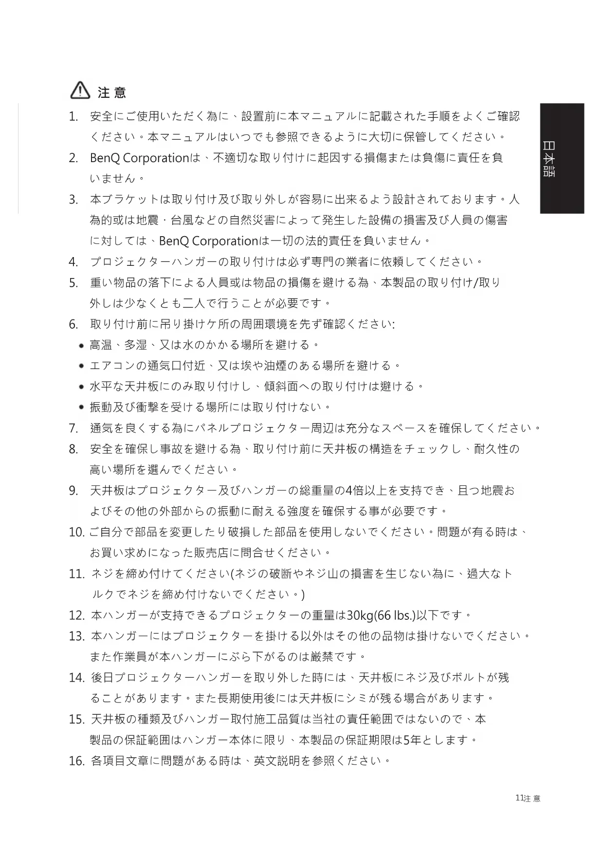 2. BenQ Corporationは、不適切な取り付けに起因する損傷または負傷に責任を負