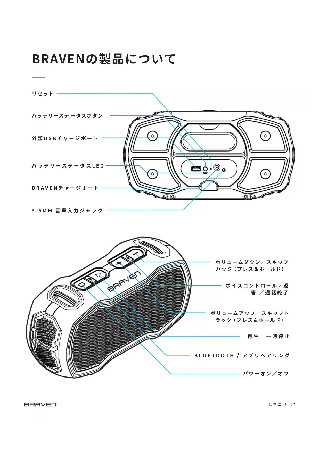 音量を上げるには短く「+」ボタンを押してください。音量を左舷るには「-」ボタンを押してください。最大ボリュ ームに達した場合オーディオ・キューが聞こえます。 スキップして 次のトラップ に 進 むには 、「+」ボタン を長 押ししてくだ さい 。スキップして 前 のトラックに 進むには 、 「-」ボタンを押してください。 BRAVEN BLUETOOTHスマートの使用 BRAVEN READYアウトドアスピーカーアプリをGoogle PlayもしくはApp Storeからダウンロードして電源オ ン、オーディオストリーミングペアを設 定して視聴経験をカスタマイズしよう。 電源とBLUE TOOTH ペアリング