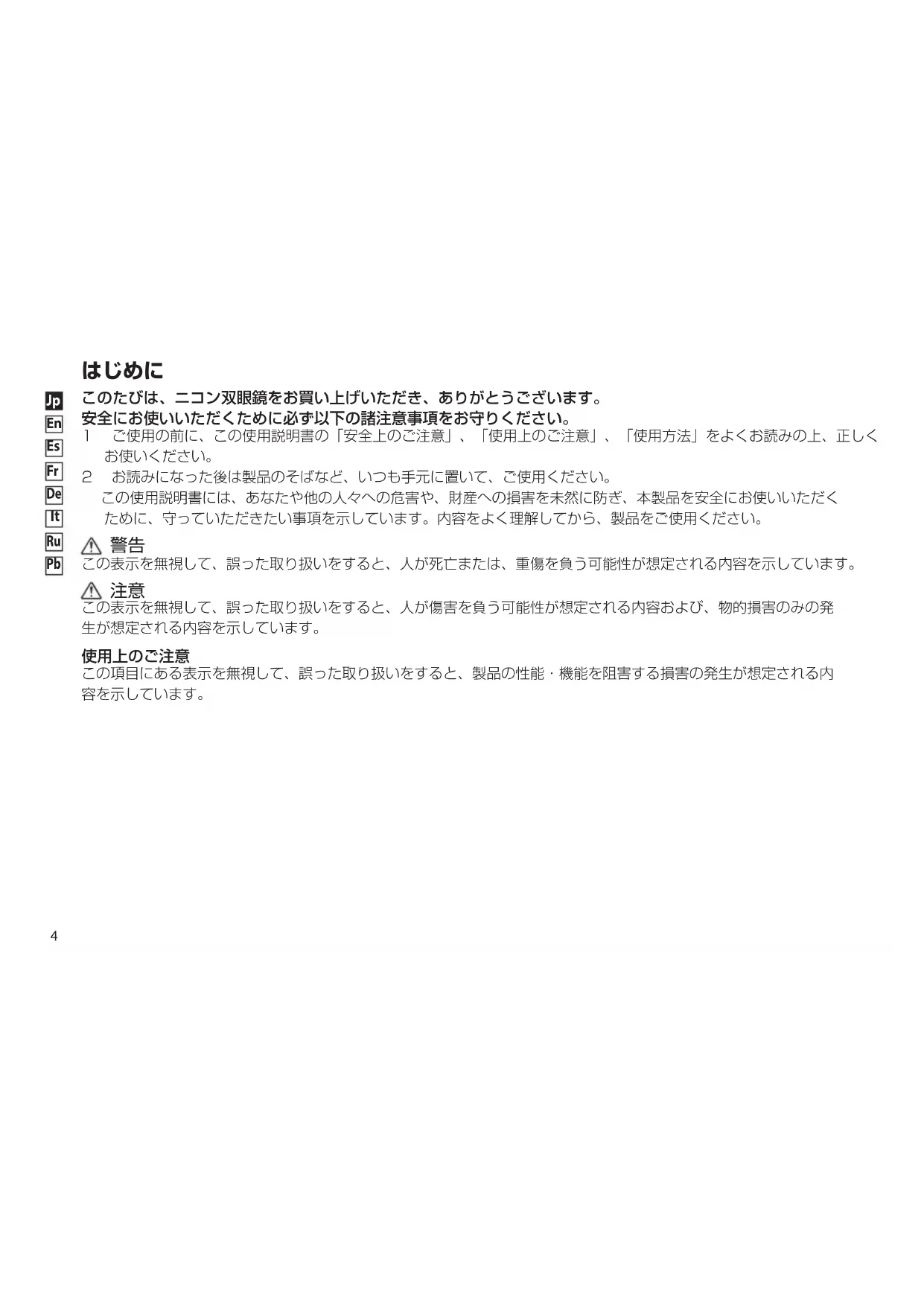このたびは、ニコン双眼鏡をお買い上げいただき、ありがとうございます。 安全にお使いいただくために必ず以下の諸注意事項をお守りください。 1 ご使用の前に、この使用説明書の「安全上のご注意」、「使用上のご注意」、「使用方法」をよくお読みの上、正しく