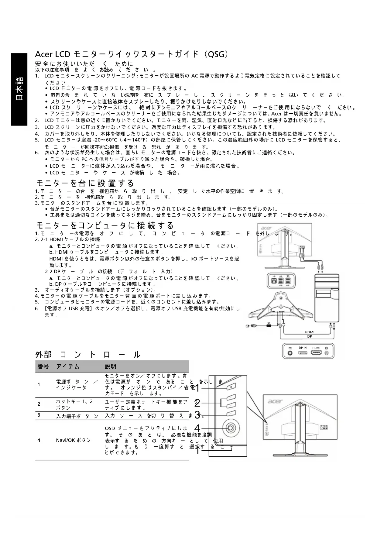 此 B 类数字设备符合加拿大 ICES-003 标准。 Remarque à l'intention des utilisateurs canadiens Cet appareil numérique de la classe B est conforme à la norme NMB-003 du Canada. 《废弃电器电子产品回收处理管理条例》提示性说明 为了更好地关爱及保护地球,当用户不再需要此产品或产品寿命终止时,请遵守国家废弃电器电子产品回收处理相关法律法规,将其交给 当地具有国家认可的回收处理资质的厂商进行回收处理。 欧盟私人家庭用户废旧设备弃置 产品或其包装上的此标志表示不得将此产品与其他生活垃圾一起弃置。反之,您有责任将废旧设备送往指定的废旧电器和 电子设备回收收集点。弃置废旧设备时进行分类收集和回收有助于节约自然资源并确保将其以保护人类健康和环境的方式 回收再利用。有关弃置废旧设备回收站的详细信息,请联系当地市政府办公室、生活垃圾处理服务或产品购买处。 在官方的 Acer 支持网站上查找 Acer 产品的手册及其它文档。 管制认证简体中文日本語 Acer LCD モニタークイックスタートガイド (QSG) 安全にお使いいただ く ために 以下の注意事項 を よ く お読み く だ さ い 。