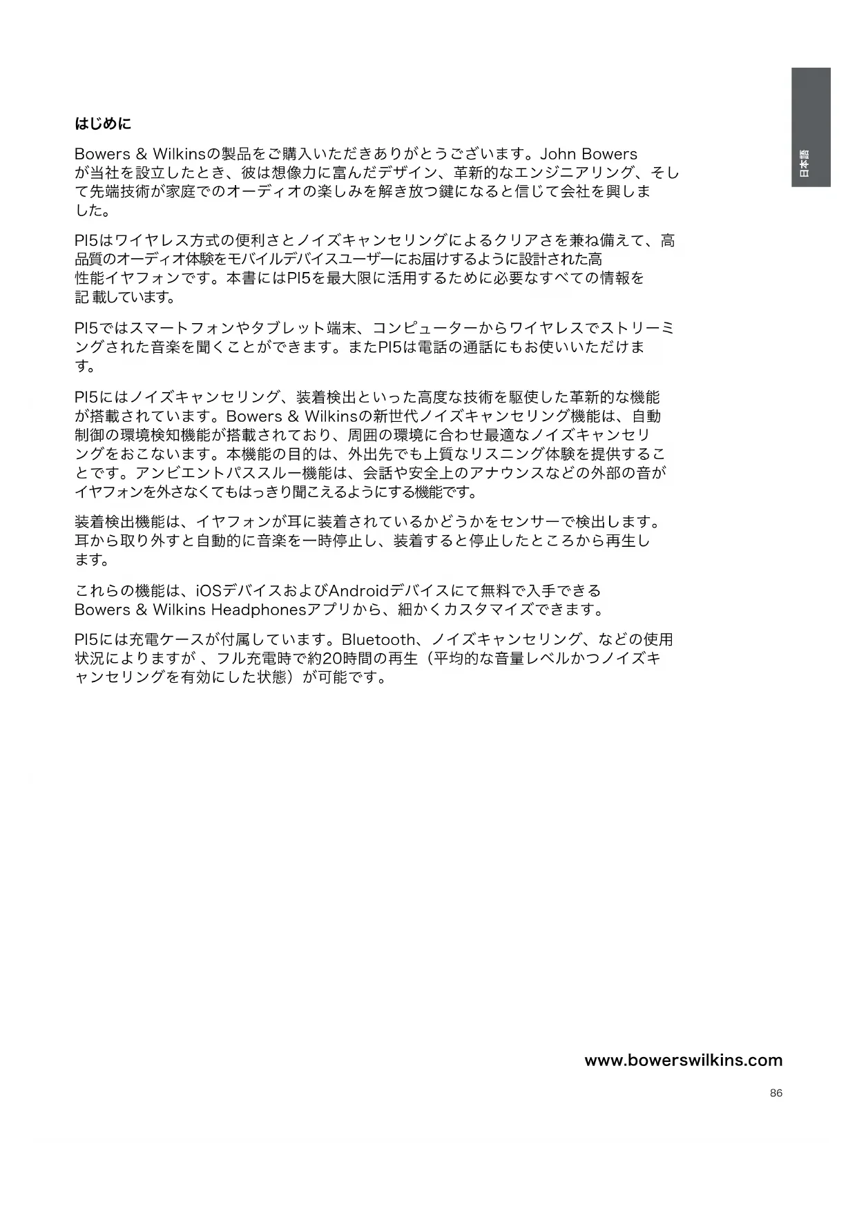 PI5では、Bowers & Wilkinsの高度な装着検出センサ ー が 両 方 のイヤフォン に 組 み 込 ま れています。イヤフォン を耳から外すとスタンバイ状態になり、インテリジェント にバッテリーを節約します。再びイヤフォンを装着したと きには、PI5が自動的に起動し、最後に接続されていた Bluetoothデバイスに接続します。 このセンサーは、イヤフォンが耳から外されたときに、オ ーディオも一時停止にします。イヤフォンを耳に戻すと、 音楽が自動的に再開されます。 装着センサーは、Bowers & Wilkins Headphones アプリから無 効にできます。 注:耳 と イヤ フォン の 間 に 髪 の 毛 や アク セ サ リ ー が 挟 まっていると、近接検出がうまくいかない場合があり ます。イヤフォンの装着時には十分ご注意ください。88