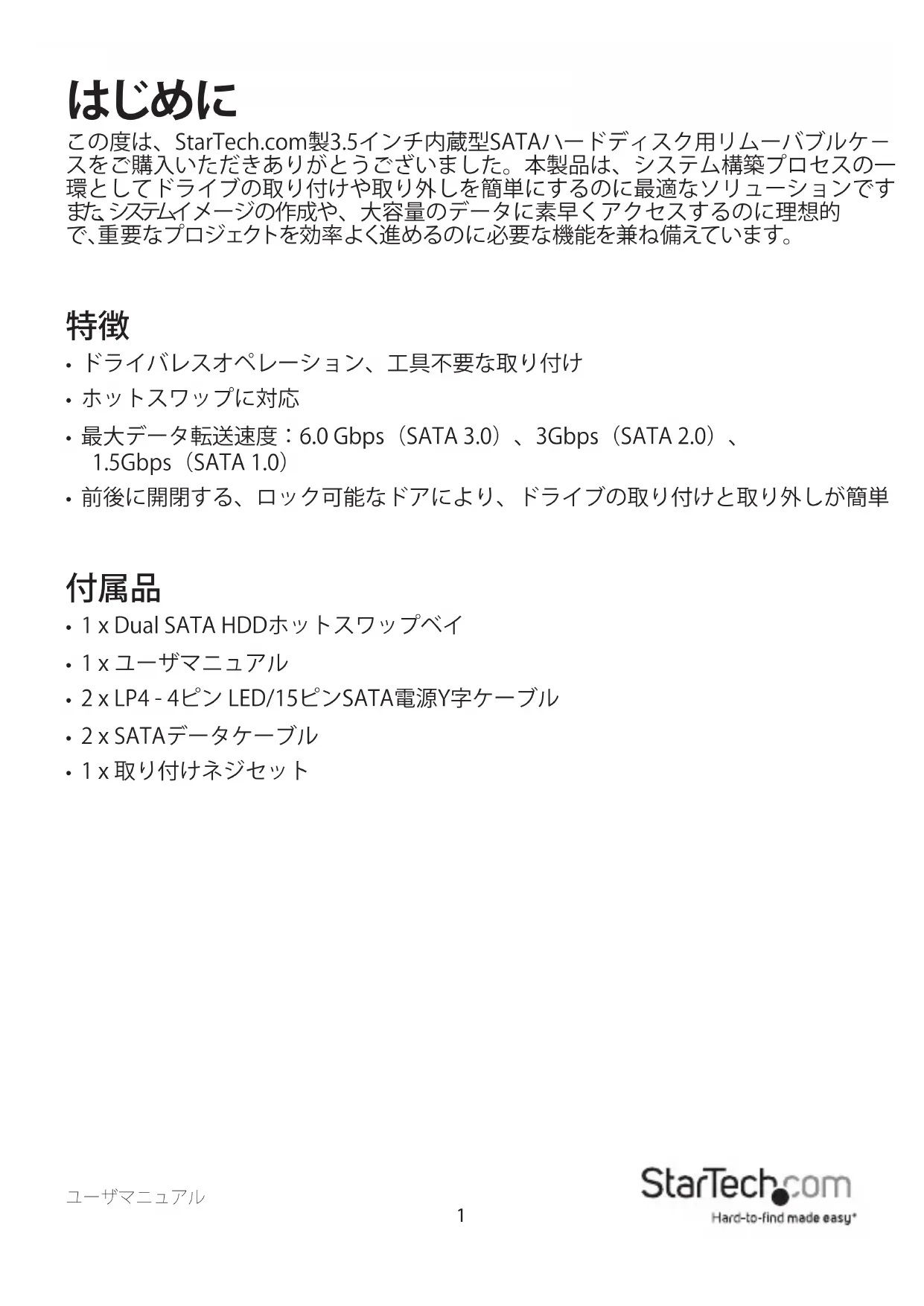 この度は、StarTech.com製3.5インチ内蔵型SATAハードディスク用リムーバブルケ- スをご購入いただきありがとうございました。本製品は、システム構築プロセスの一 環としてドライブの取り付けや取り外しを簡単にするのに最適なソリューションです。 ま た 、シ ス テ ム イメージの作成や、大容量のデータに素早くアクセスするのに理想的 で、重要なプロジェクトを効率よく進めるのに必要な機能を兼ね備えています。