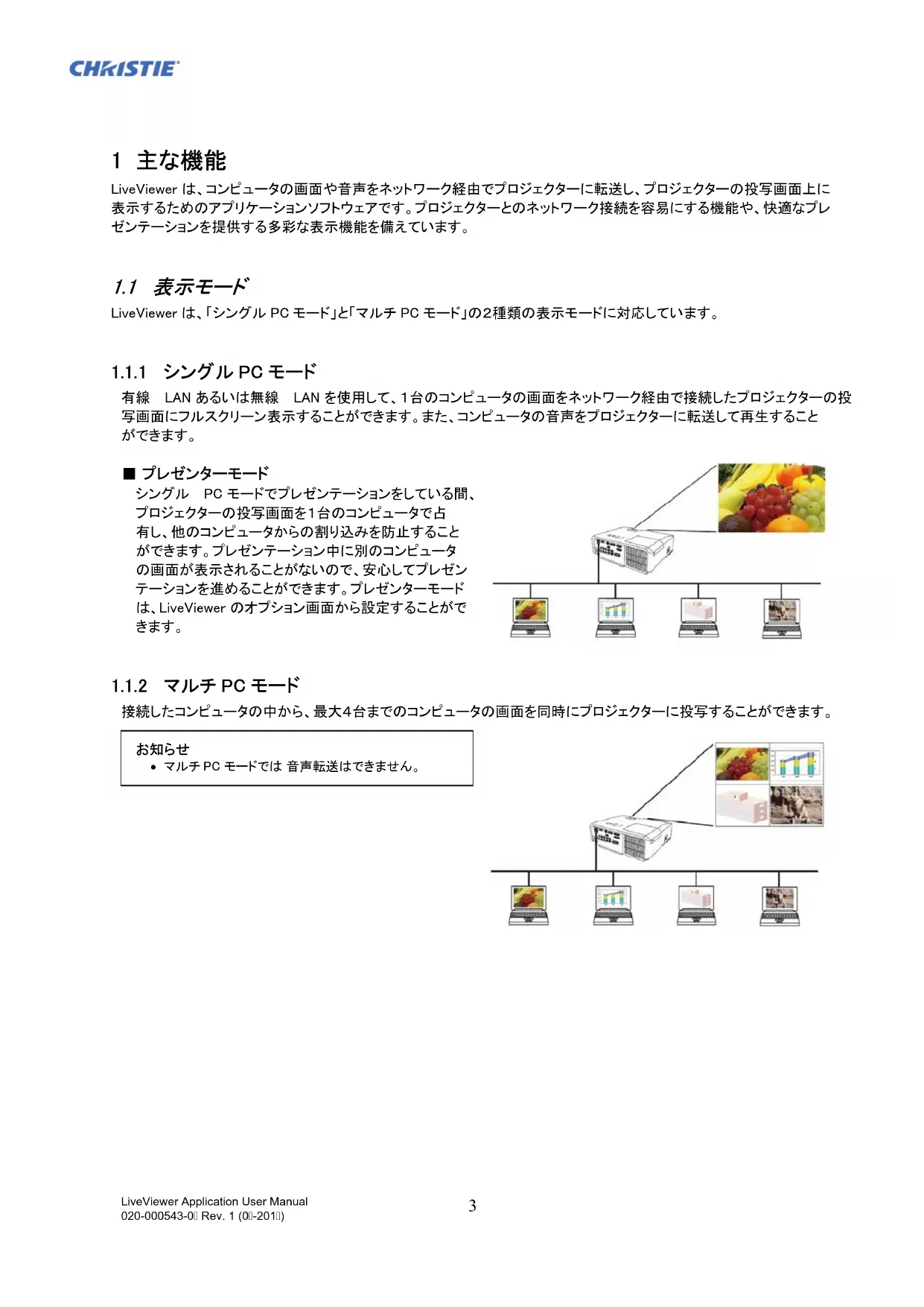 - 付録 LiveViewer Application User Manual 020-000543-0 Rev. 1 (0-201)3 1 主な機能 LiveViewer は、コンピュータの画面や音声をネットワーク経由でプロジェクターに転送し、プロジェクターの投写画面上に表示するためのアプリケーションソフトウェアです。プロジェクターとのネットワーク接続を容易にする機能や、快適なプレゼンテーションを提供する多彩な表示機能を備えています。 p. 36