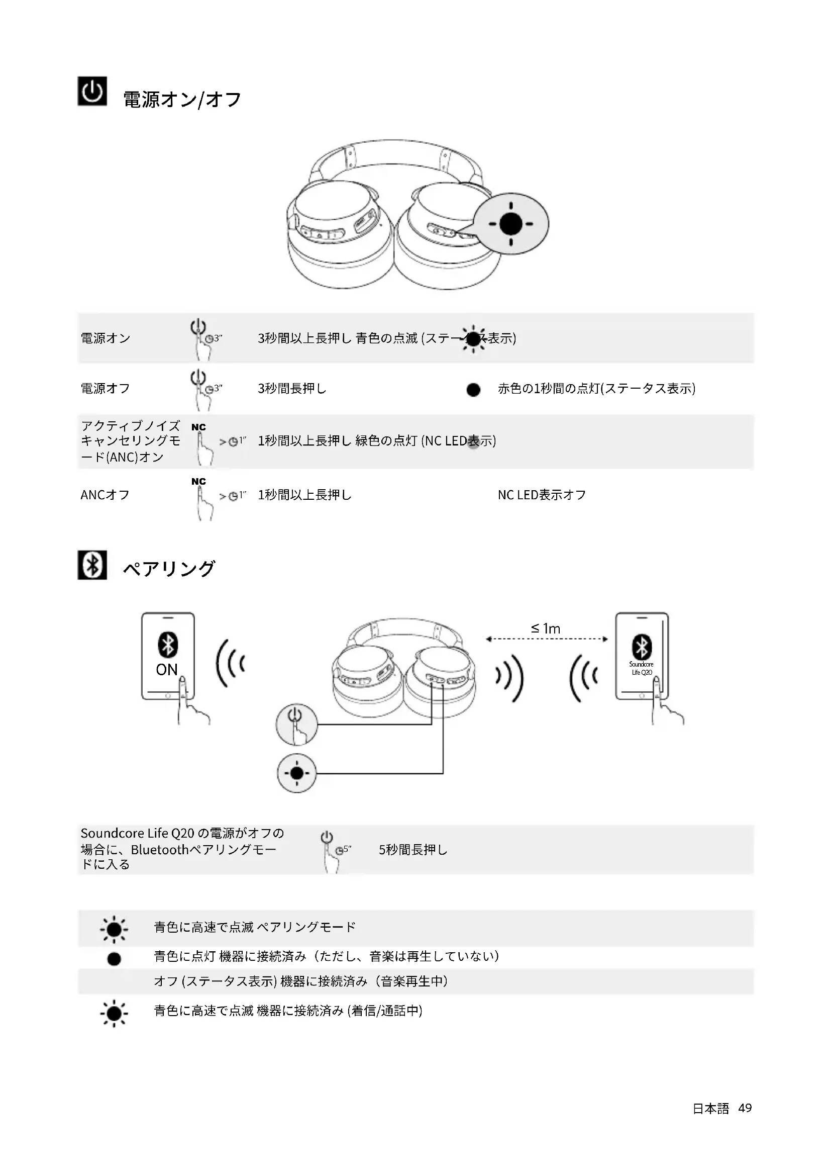 5秒間長押し 青色に高速で点滅 ペアリングモード 青色に点灯 機器に接続済み(ただし、音楽は再生していない) オフ (ステータス表示) 機器に接続済み(音楽再生中) 青色に高速で点滅 機器に接続済み (着信/通話中)50