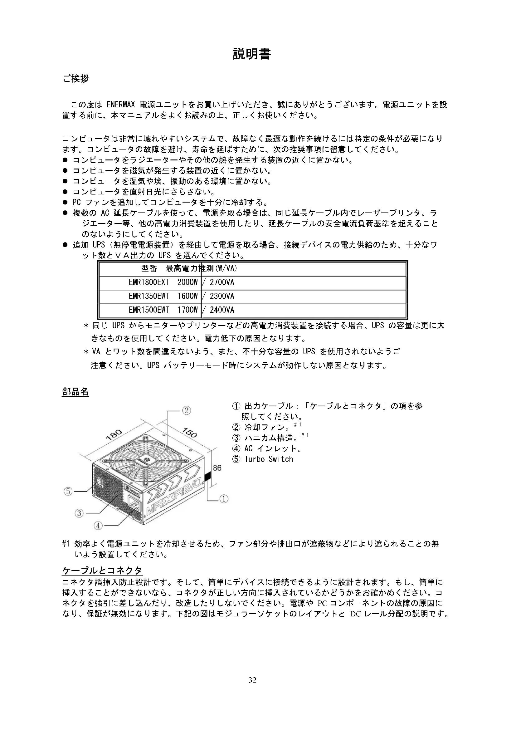 この度は ENERMAX 電源ユニットをお買い上げいただき、誠にありがとうございます。電源ユニットを設 置する前に、本マニュアルをよくお読みの上、正しくお使いください。 コンピュータは非常に壊れやすいシステムで、故障なく最適な動作を続けるには特定の条件が必要になり ます。コンピュータの故障を避け、寿命を延ばすために、次の推奨事項に留意してください。 コンピュータをラジエーターやその他の熱を発生する装置の近くに置かない。 コンピュータを磁気が発生する装置の近くに置かない。 コンピュータを湿気や埃、振動のある環境に置かない。 コンピュータを直射日光にさらさない。 PC ファンを追加してコンピュータを十分に冷却する。 複数の AC 延長ケーブルを使って、電源を取る場合は、同じ延長ケーブル内でレーザープリンタ、ラ ジエーター等、他の高電力消費装置を使用したり、延長ケーブルの安全電流負荷基準を超えること のないようにしてください。 追加 UPS(無停電電源装置)を経由して電源を取る場合、接続デバイスの電力供給のため、十分なワ ット数とVA出力の UPS を選んでください。 型番 最高電力推測(W/VA)