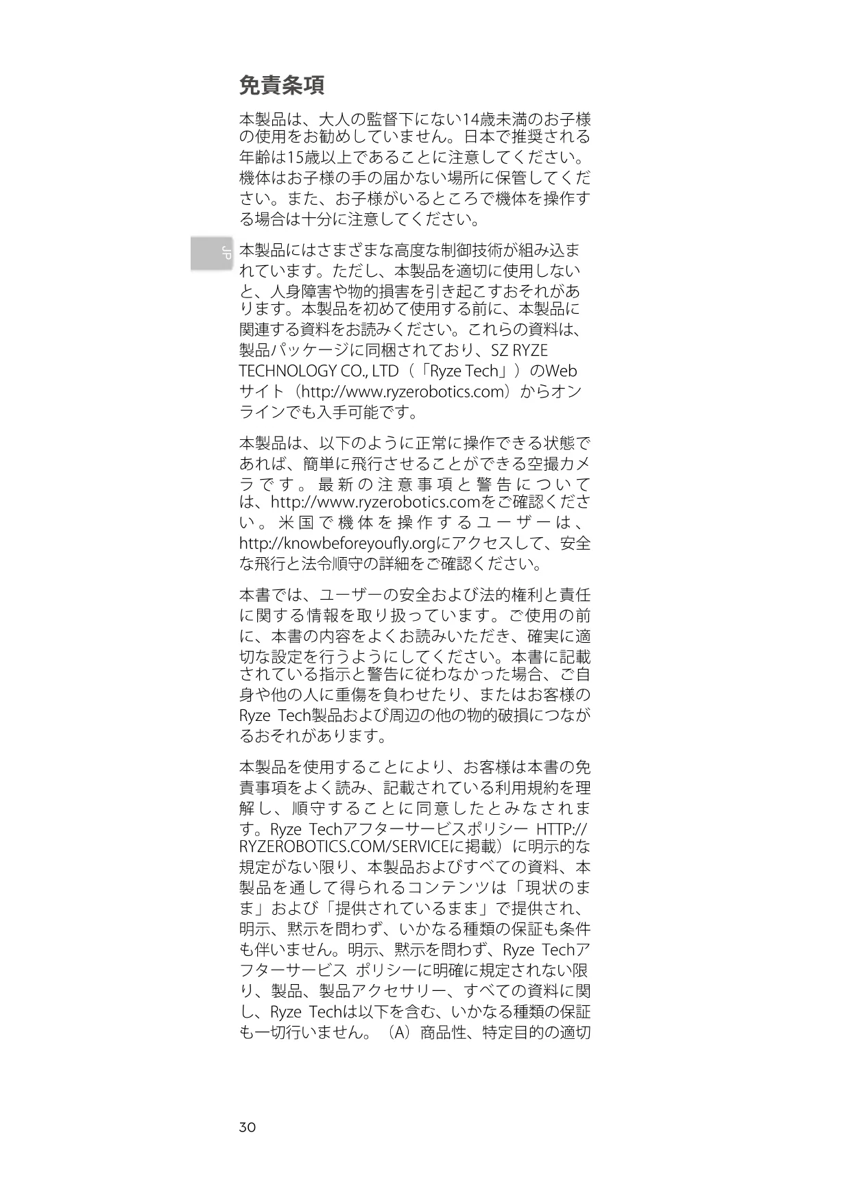 本製品は、大人の監督下にない14歳未満のお子様 の使用をお勧めしていません。日本で推奨される 年齢は15歳以上であることに注意してください。 機体はお子様の手の届かない場所に保管してくだ さい。また、お子様がいるところで機体を操作す る場合は十分に注意してください。 本製品にはさまざまな高度な制御技術が組み込ま れています。ただし、本製品を適切に使用しない と、人身障害や物的損害を引き起こすおそれがあ ります。本製品を初めて使用する前に、本製品に 関連する資料をお読みください。これらの資料は、 製品パッケージに同梱されており、SZ RYZE TECHNOLOGY CO., LTD(「Ryze Tech」)のWeb サイト(http://www.ryzerobotics.com)からオン ラインでも入手可能です。 本製品は、以下のように正常に操作できる状態で あれば、簡単に飛行させることができる空撮カメ ラです。最新の注意事項と警告について は、http://www.ryzerobotics.comをご確認くださ い。米国で機体を操作するユーザーは、 http://knowbeforeyouy.orgにアクセスして、安全 な飛行と法令順守の詳細をご確認ください。 本書では、ユーザーの安全および法的権利と責任 に関する情報を取り扱っています。ご使用の前 に、本書の内容をよくお読みいただき、確実に適 切な設定を行うようにしてください。本書に記載 されている指示と警告に従わなかった場合、ご自 身や他の人に重傷を負わせたり、またはお客様の Ryze Tech製品および周辺の他の物的破損につなが