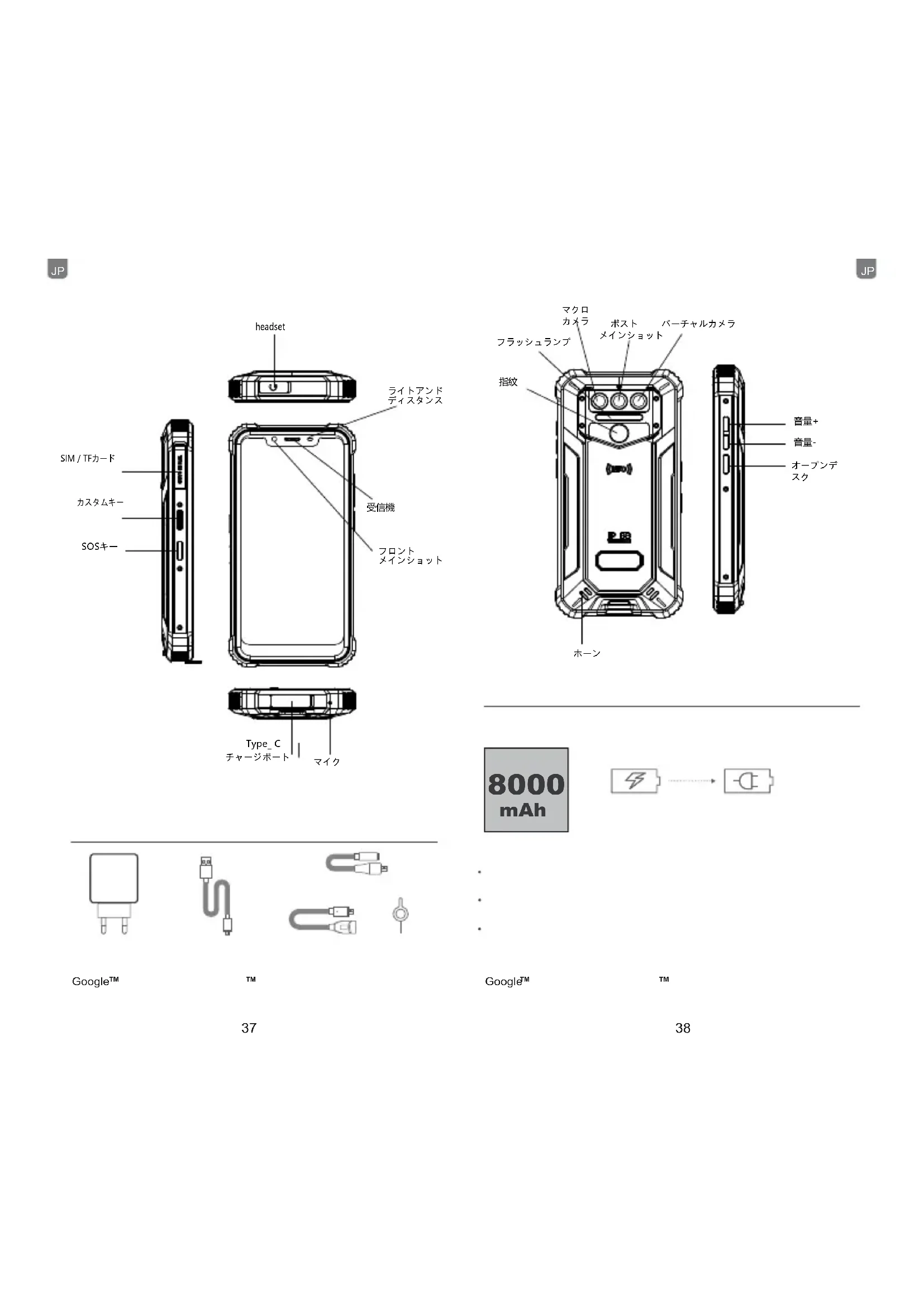 会社は事故の責任を負いません 非標準関連の充電装置によって引き起こされます。 CEコンプライアンスの全文を読みたい場合は、チェックして くださいこのリンク:https://www.oukitel.com バッテリーを落としたり、つぶしたり、引っかいたり、穴を開 けたりしないでください。バッテリーに過度の外圧がかかると、 バッテリーの内部短絡と過熱。 バッテリーを分解またはリセットしたり、他の物を挿入したり しないでください。バッテリーの液漏れを防ぐため、水または その他の液体に浸します。過熱、火災または爆発。 JP JP Google