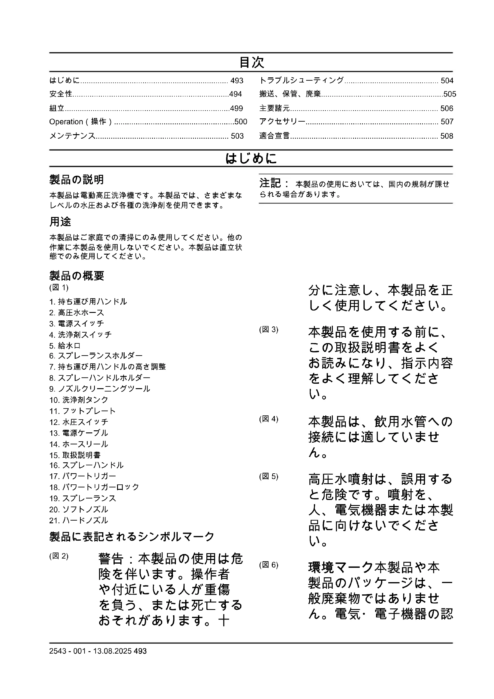 警告: 本製品のメンテナンスを行う前に、 電源スイッチをオフ(0)の位置にして、電 源プラグをコンセントから外してください。 2543 - 001 - 13.08.2025 503注意: 本製品のメンテナンスを行う前に、 本製品を水源から外し、すべての部品が乾い ていることを確認してください。